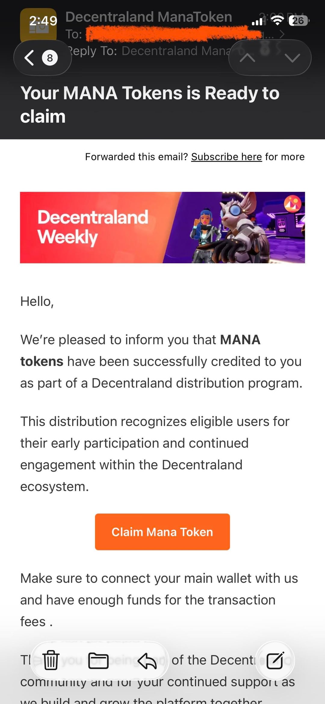 Ich erhielt eine E-Mail mit der Behauptung, ich sei ein „Early Adopter“, der Anspruch auf kostenlose MANA-Token habe. Die E-Mail sah legitim aus und verwendete das Decentraland-Branding, aber durch Klicken auf die Schaltfläche und Verbinden einer Wallet werden sofort Gelder abgezogen.