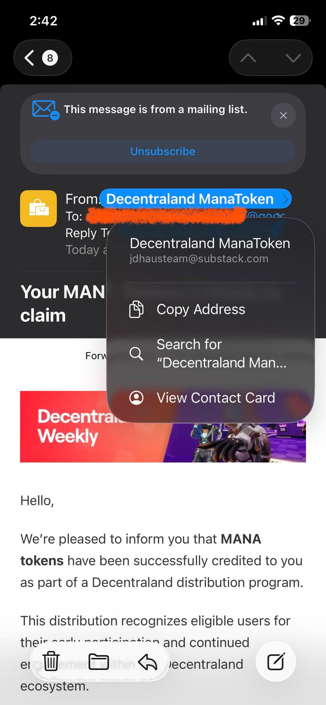 Die Nachricht wurde über Substack gesendet, nicht von einer offiziellen Decentraland-Domain. Ich war ein Early Adopter und bin mir daher nicht sicher, wie ich angegriffen wurde (möglicherweise eine durchgesickerte oder verletzte Liste). Ich habe den Absender Substack gemeldet.