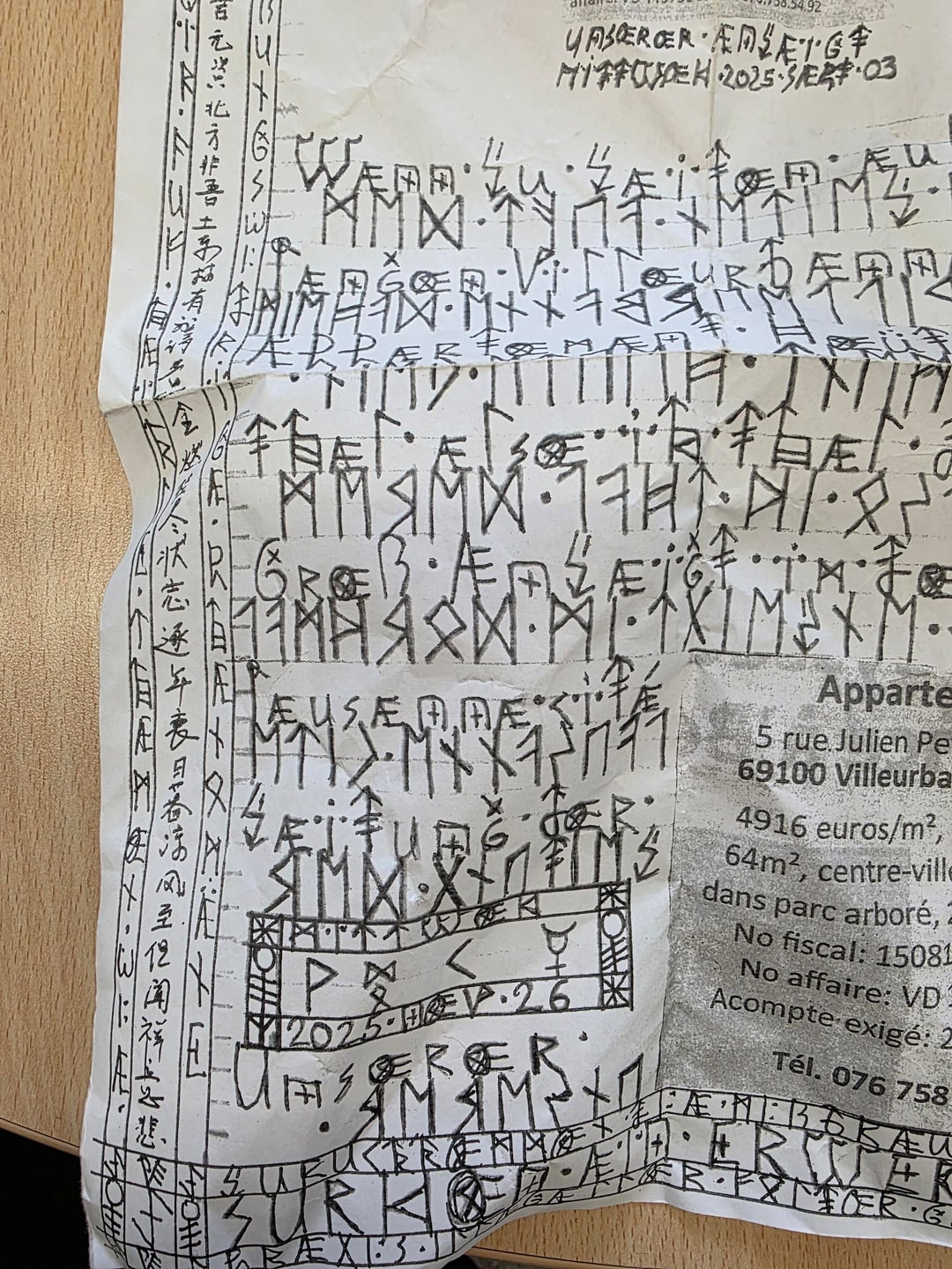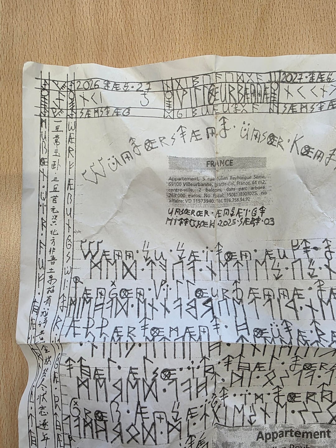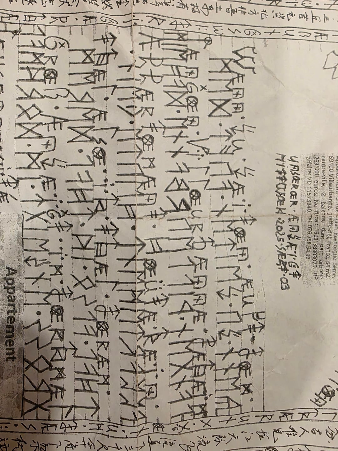 Looks like germanic runes to me, but I put it through Grok quickly and it looks like someone just stylized French in this „runic“ way, can’t help you with deciphering it tho.