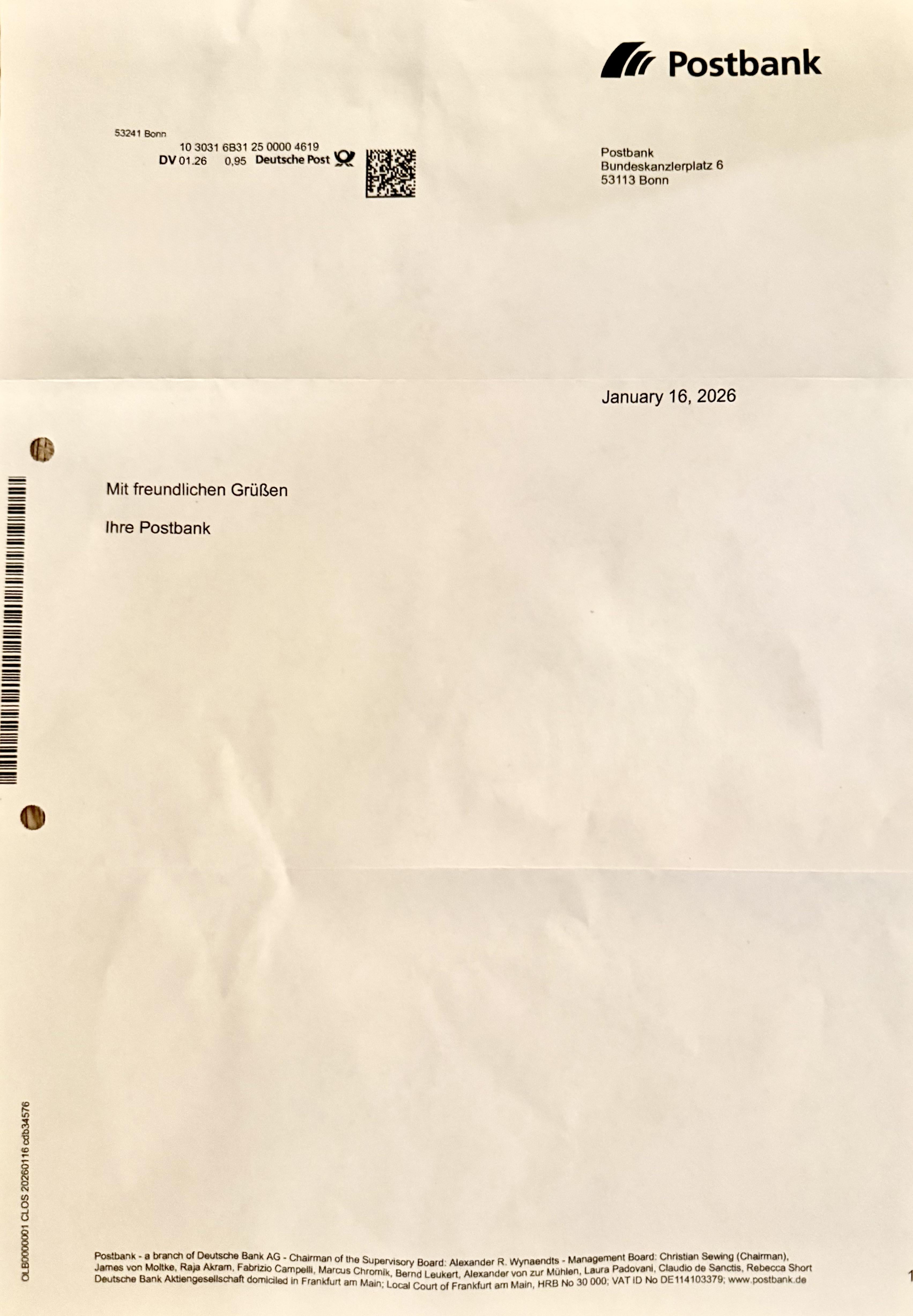 Heute habe ich einen Brief von der Postbank erhalten, nur die Nachricht wie auf dem Foto abgebildet. Muss ich das Papier für die versteckte Botschaft erhitzen?