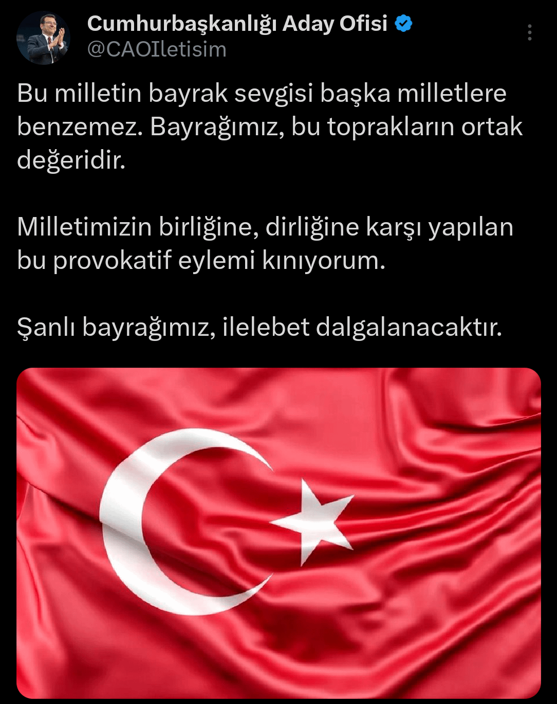 Ekrem İmamoğlu über den YPG-Angriff auf unsere Flagge an der Grenze: Die Liebe dieser Nation zur Flagge ist anders als bei anderen Nationen. Unsere Flagge ist der gemeinsame Wert dieser Länder. Ich verurteile diese provokative Aktion gegen die Einheit und Solidarität unserer Nation. Unsere glorreiche Flagge wird für immer wehen.
