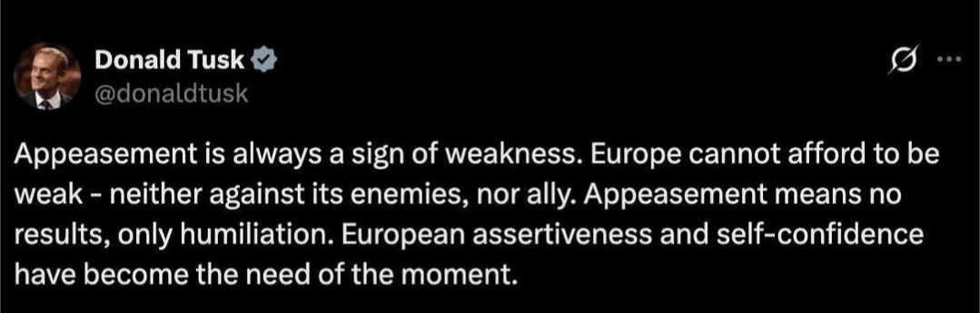 "Zugeständnisse sind immer ein Zeichen von Schwäche. Europa kann es sich nicht leisten, schwach zu sein – weder gegenüber seinen Feinden noch gegenüber seinen Verbündeten. Zugeständnisse bringen keine Ergebnisse, sondern nur Demütigung. Europäisches Durchsetzungsvermögen und Selbstbewusstsein sind zum Gebot der Stunde geworden."