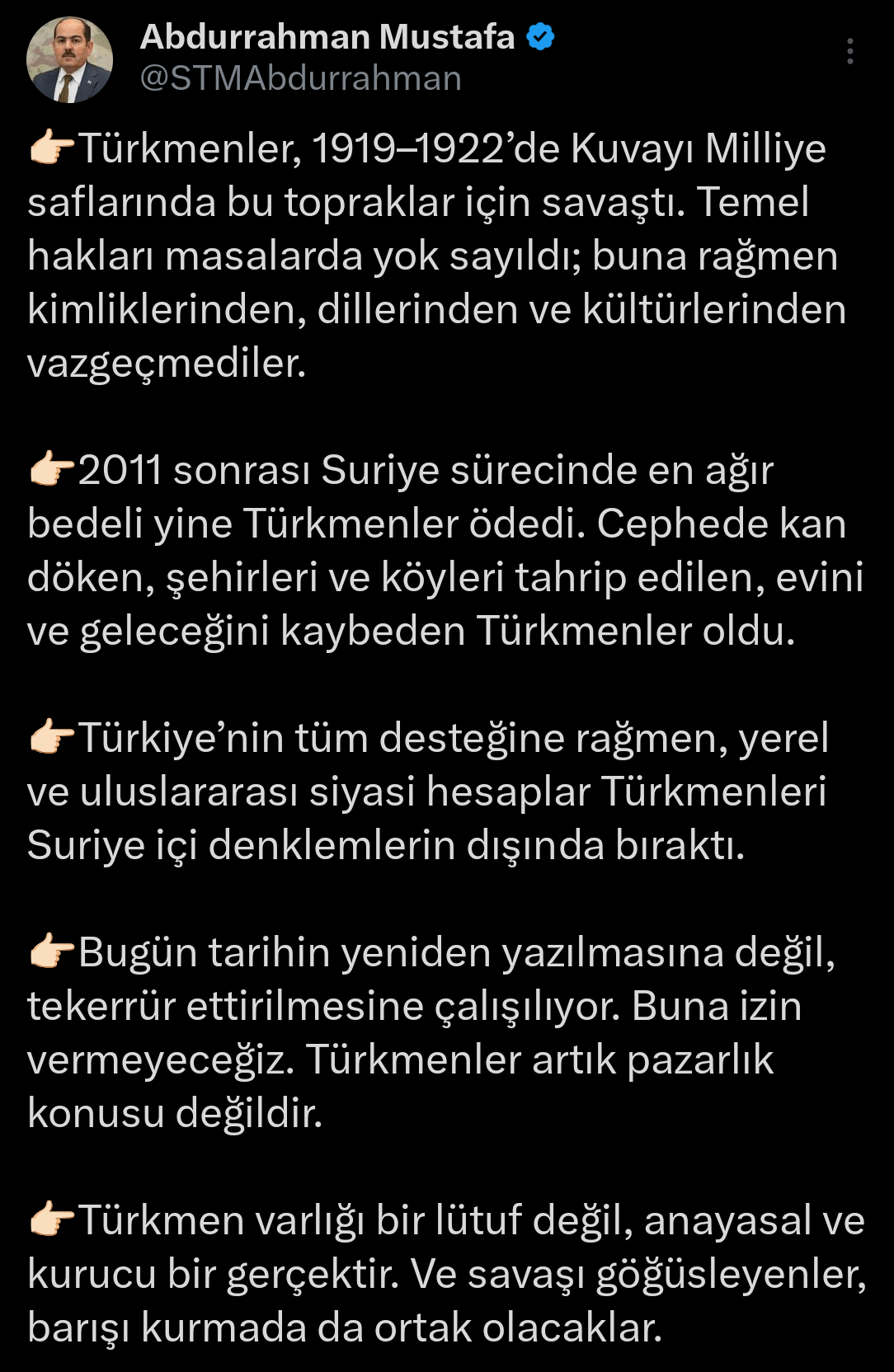 Abdurrahman Mustafa, ehemaliger Chef der syrischen Übergangsregierung, die im März 2025 aufgelöst und der Regierung von Damaskus angegliedert wurde: Lokale und internationale politische Berechnungen ließen die Turkmenen aus den innersyrischen Gleichungen heraus. Heute versuchen sie, die Geschichte nicht neu zu schreiben, sondern dafür zu sorgen, dass sie sich wiederholt. Das werden wir nicht zulassen.