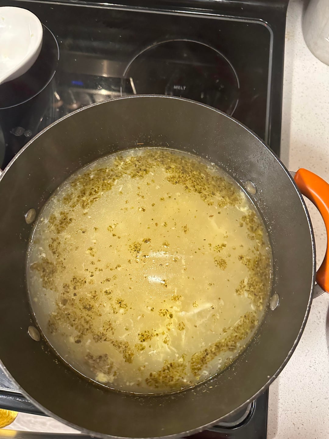 It looks really good. You have to skim off the foam that forms during cooking. If you made the broth from scratch. If you don’t, the broth will be cloudy. A strainer is best, but you can also use a spoon.