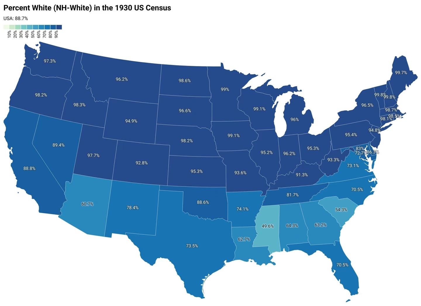 Zu dieser Zeit machten Weiße fast 90 % der amerikanischen Bevölkerung aus, wobei Neuengland, die Region der Großen Seen, die Great Plains des Mittleren Westens und der Nordwesten überwiegend weiß waren; Die Schwarzen waren hauptsächlich in einigen südöstlichen Bundesstaaten konzentriert.
