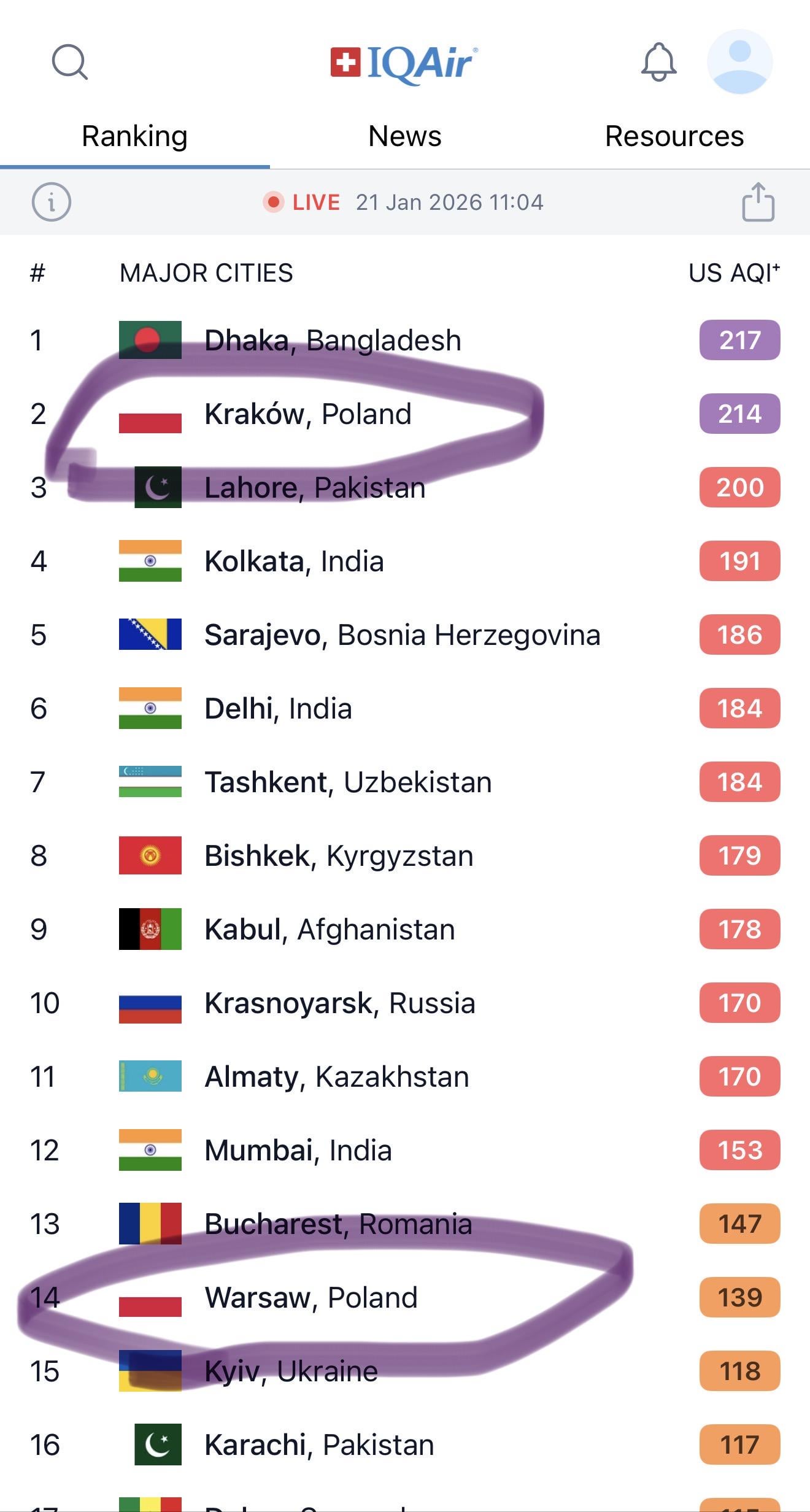 I agree that the air in Warsaw is bad but at the same level as Karachi it’s a bit weird