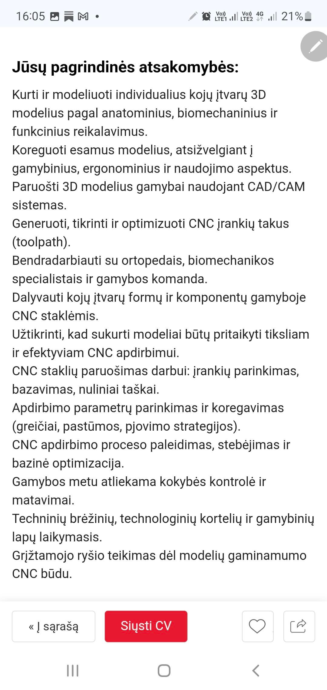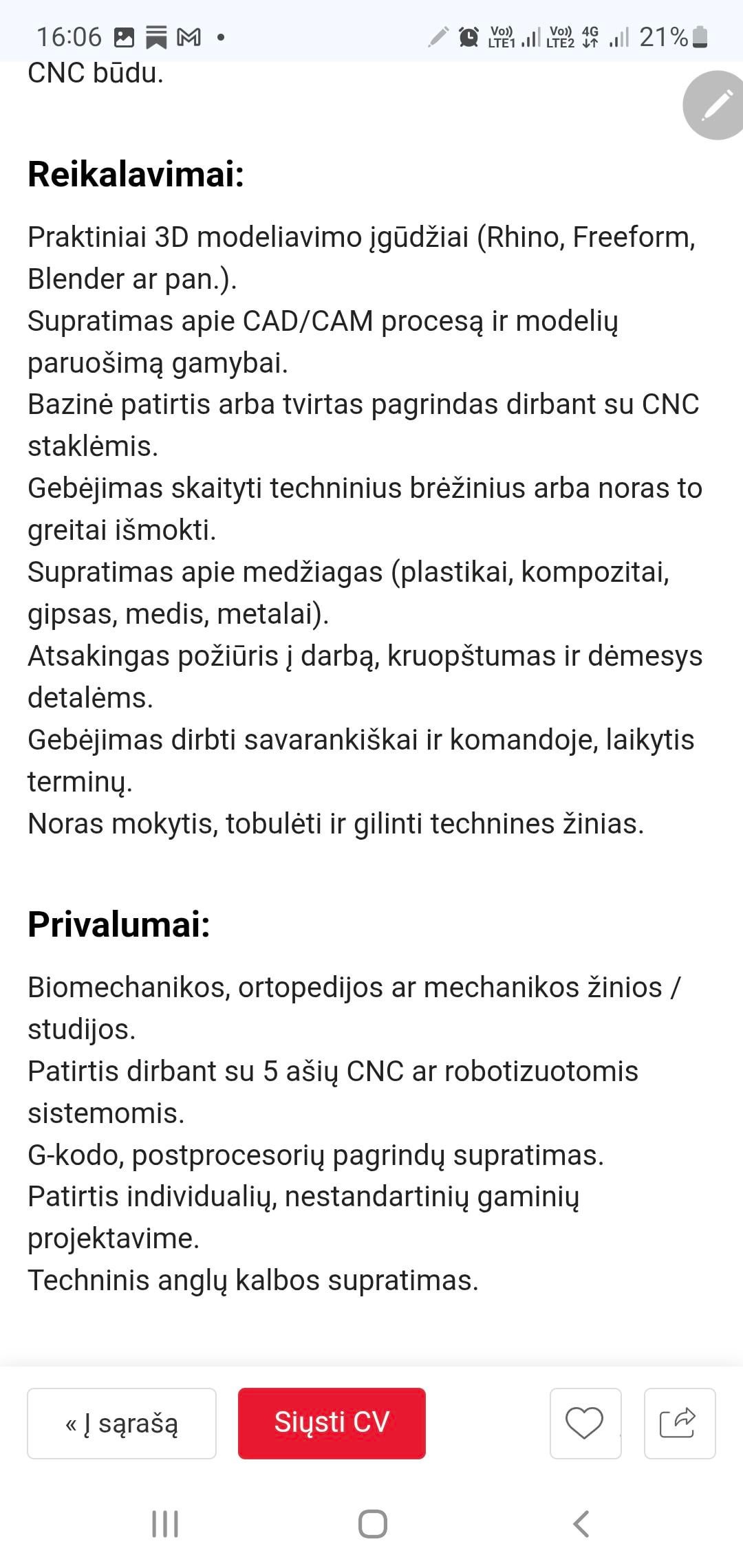 mcleanlt on 21.01.2026 2:17 p.m. Vos 243 eurais (prieš mokesčius) daugiau nei minimalus atlyginimas. Keista, kad neįtrauktas aukštojo mokslo reikalavimas, musiau tiek susiprato, bet žinių ir patirties reikalavimai tai jo.