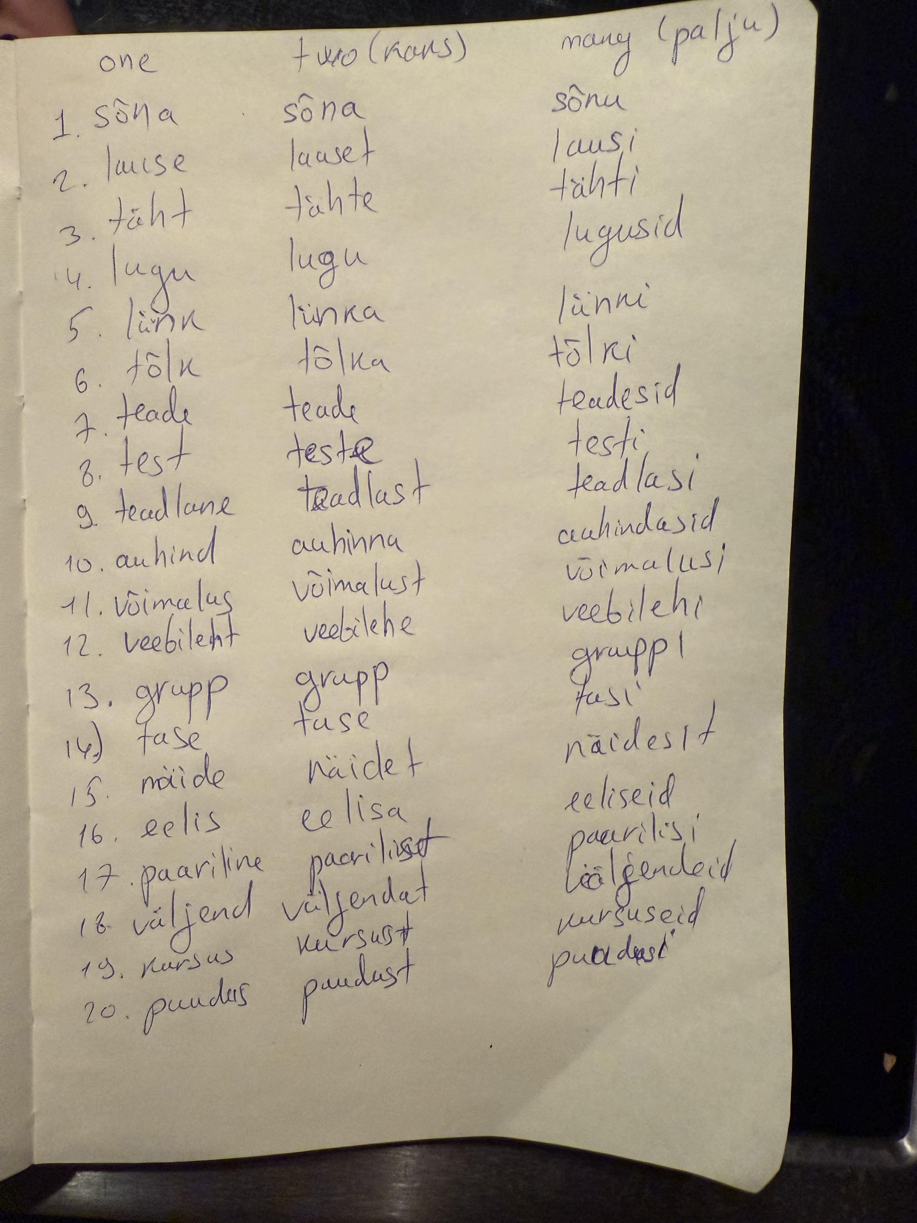 Soweit ich weiß, muss man als Ausländer neue Wörter auf Estnisch lernen 3 verschiedene Fälle: Nimetav, Omastav und Osastav. Das Foto stammt aus der Übung, in der ich versuche, Wörter zu schreiben, bei denen man eins (nimetav), zwei (erfordert osastav), viele sagen sollte – palju (osastav im Plural). Benutzen Esten diese Fälle in der Umgangssprache richtig? Auf dem Foto oben habe ich versucht, 20 Wörter zu erraten (wahrscheinlich habe ich eine Menge Fehler gemacht). Ich frage mich, ob Muttersprachler es richtig wissen, wenn ich es als Ausländer sage viele Worte anstatt viele Worte wäre es ein auffälliges Fehler?