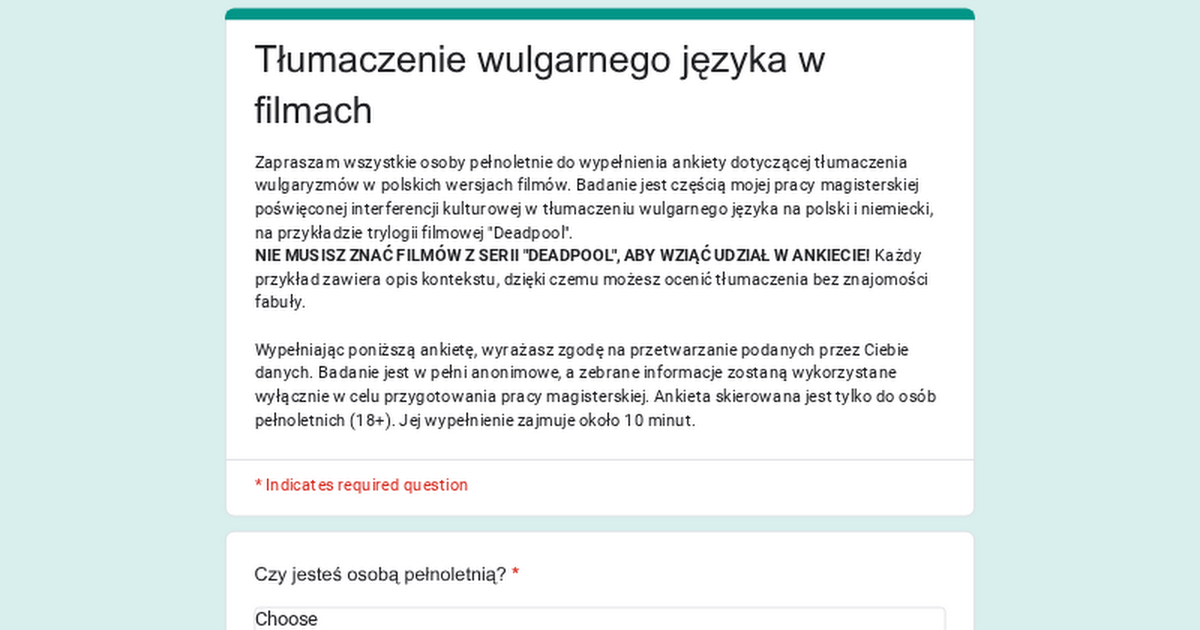 Hallo! Ich schreibe meine Masterarbeit über die Übersetzung von Obszönitäten in Filmuntertiteln und führe dazu eine Umfrage durch. Die Umfrage ist völlig anonym und dauert nur etwa 10 Minuten. Link: