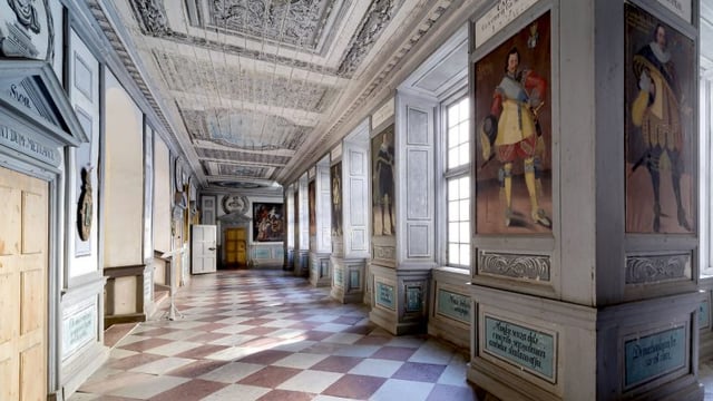 Bild 1: Schloss Skokloster. Bild 2: Carl Gustaf Wrangel. Bilder 3 – 9: Innenräume, mit der Waffenkammer auf den letzten beiden Bildern.