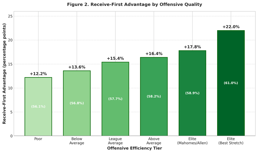 Abbildung 2 zeigt, wie der „Receive-First“-Vorteil mit der Offensivqualität skaliert. Kontraintuitiv profitieren bessere Angriffe davon mehr vom Empfangen, nicht weniger.