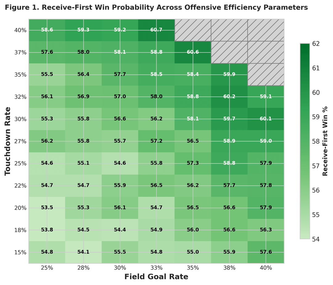 Abbildung 1 bildet die Wahrscheinlichkeit des ersten Sieges über verschiedene Parameter der Offensiveffizienz ab (Touchdown-Rate vs. Field-Goal-Rate). Jede Zelle überschreitet 50 %, was bedeutet, dass es keine Kombination realistischer Parameter gibt, bei der das erste Treten optimal ist.