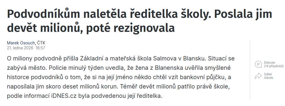 *Podobný případ se loni stal v Brně, kde ředitelka mateřské školy uvěřila telefonátu podvodníků, že peníze zařízení jsou v ohrožení.* [*Domnělým policistům pak předala v hotovosti bezmála dva miliony korun*](https://www.idnes.cz/brno/zpravy/reditelka-materska-skola-obet-podvodnici-penize-brno.A250430_152946_brno-zpravy_krut)*. Krátce před Vánocemi se k této situaci plánovali vrátit brněnští radní, nakonec však tento bod stáhli z jednání.* ***Tamní ředitelka ve funkci zůstala.***