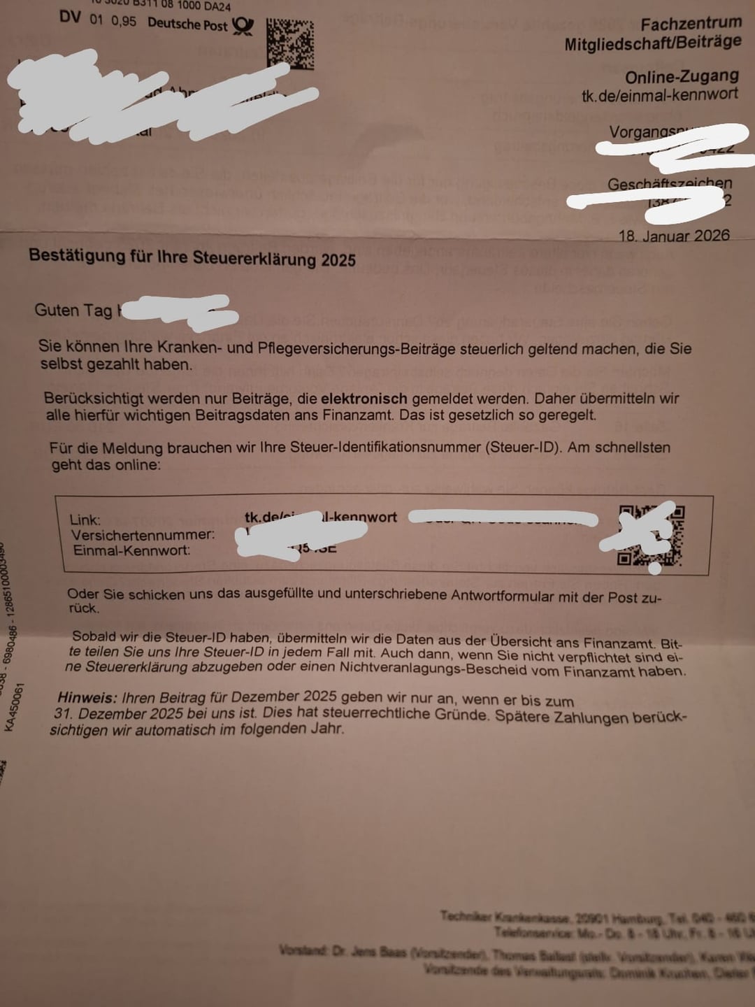 You can deduct the part of the health insurance that you pay yourself. You report this in your Steuererklärung, but for automatic reporting the Finanzamt needs the data directly from the health insurance. For that, they need your tax ID. Since you didn’t provide it before Dec 31, they won’t transmit the data for that year. You can usually request it later or just enter the amounts yourself using the statement from the insurance. Once you have the tax ID, send it to them so it works automatically in the future.