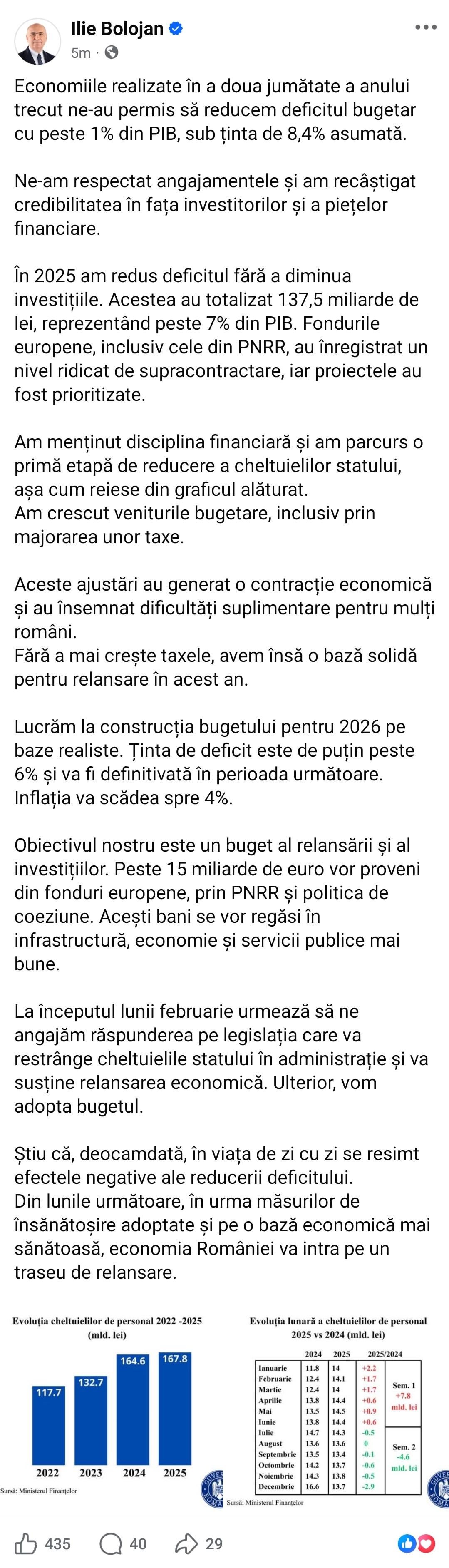Eu il cred. Drept dovada deficitul pe anul asta a fost mai mic decat targetul asumat. Pe orice economist mai serios il ascult, nu papagal de facebook, inteleg ca Bolojan a facut sa nu intre tara in gard desi destinatia aia era.