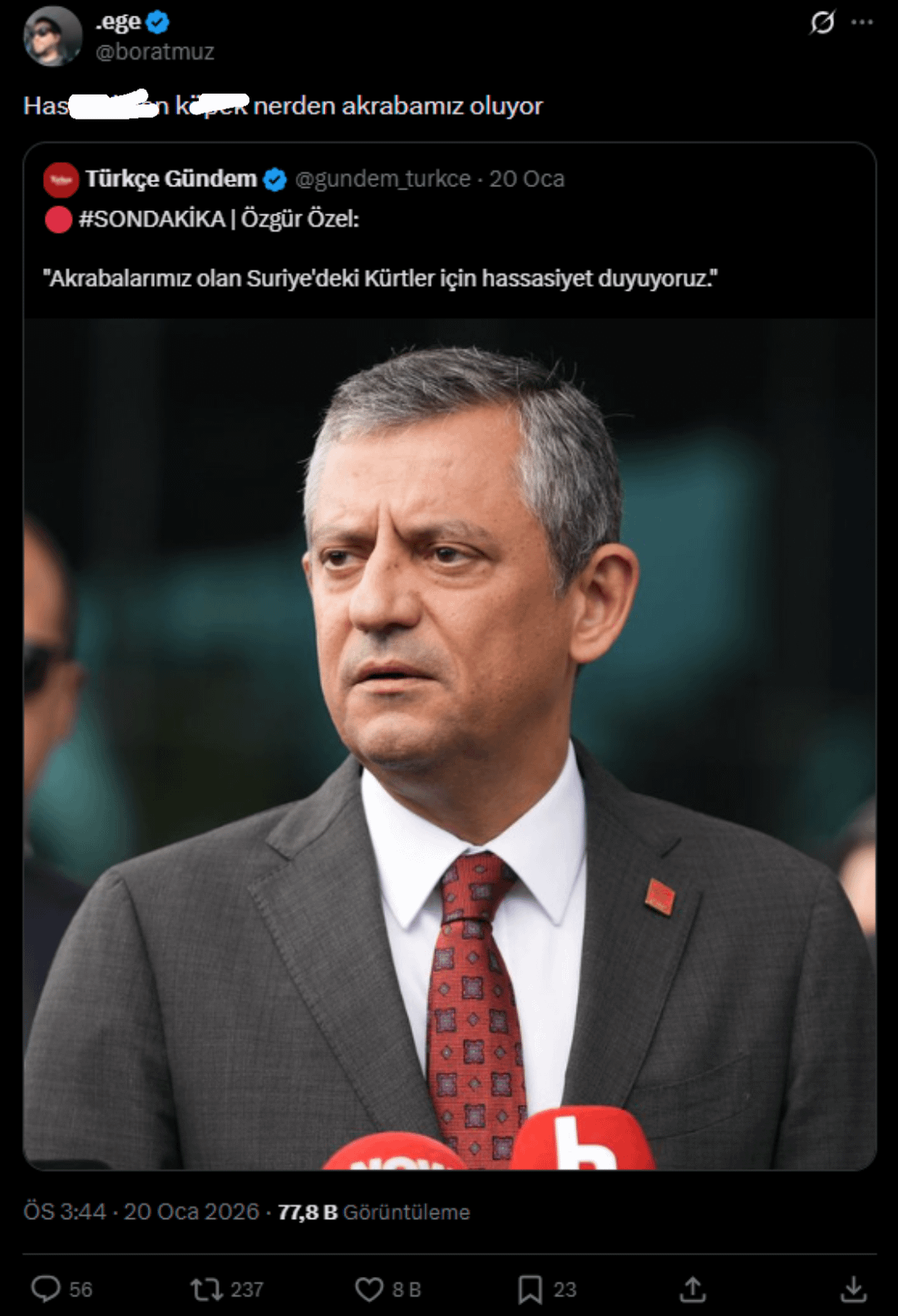 Sanki Özel’in bir tek bu açıklaması var. Herif çıkıp “PYD kardeş partimizdir” falan diyor. Erdoğan’ın amacı, ABD’nin sümüklü peçete gibi kullanıp attığı PKK’yı oy amaçlı kullanmak. YPG’ye ise hala karşı duruyor askiyonlarına bakınca. Kusura bakmayın ama Özel gelirse YPG’ye destek için Suriye’ye savaş falan bile açabilir gibi geliyor bana. Bu yüzden oy moy yok, İYİ’ye falan verip geçerim(Bana uygun parti maalesef yok). CHP ise 300’ü geçemeyecekleri için mecburen bunlarla oturacak. Güncel sistemde meclis çoğunluğu + cumhurbaşkanı olunca at koşturuluyor. CHP’nin tek başına 300’ü geçme imkanı yok. DEM’den fazla oy alıyor İYİ-ZP gibi partiler hatta tek başına İYİ bile daha büyük parti. 2. tur öncesi Özdağ’ın kapısını çaldıkları gibi mecbur bırakacaksınız bunları. CHP trollerinin sanki tek muhalif parti varmış gibi algılarına kanmayın, size tam uygun olmasa bile AKP’yi diğer muhaliflere vererekte yollayabilirsiniz.