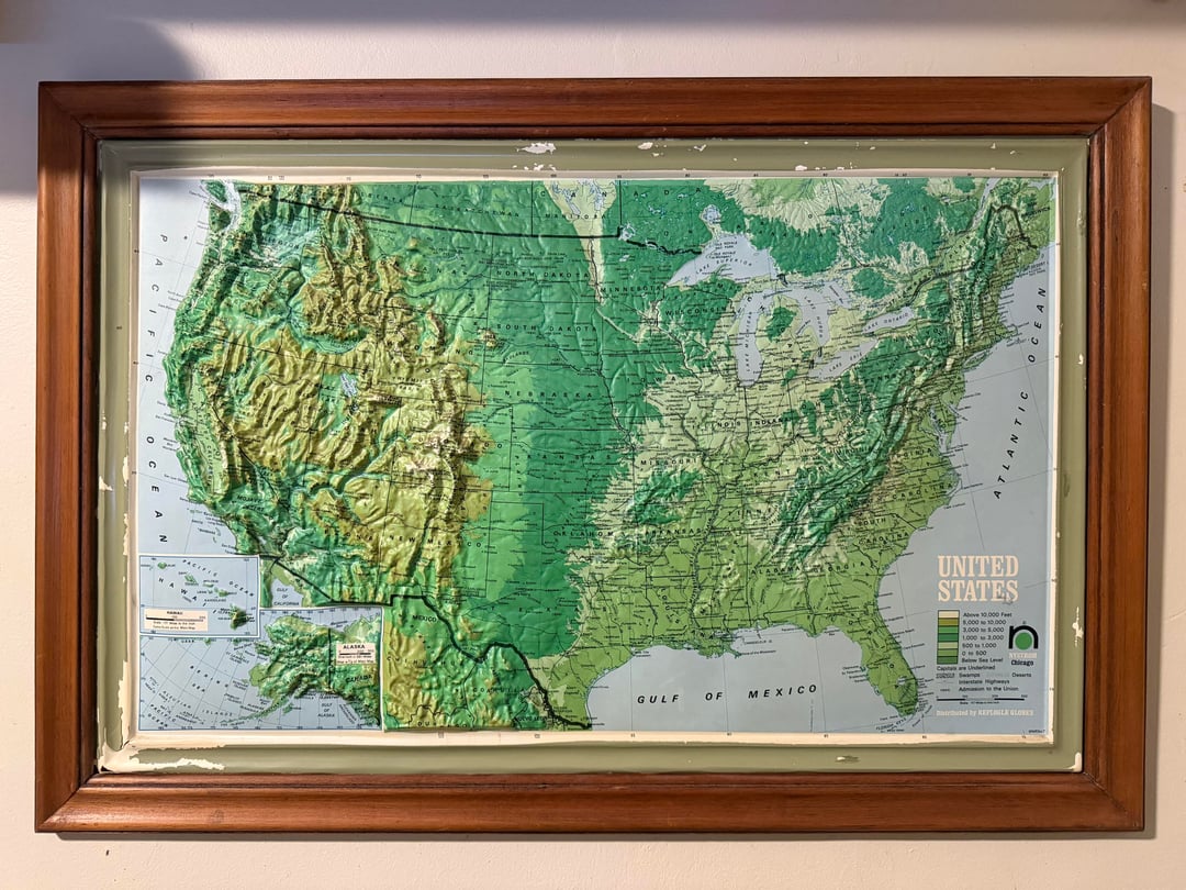 In the bottom right you can see “Distributed by Replogle Globes.” Replogle was the dominant school map company in the US from the 1950s through the 1970s, but this specific design language is earlier Replogle, not their later 70s stuff.