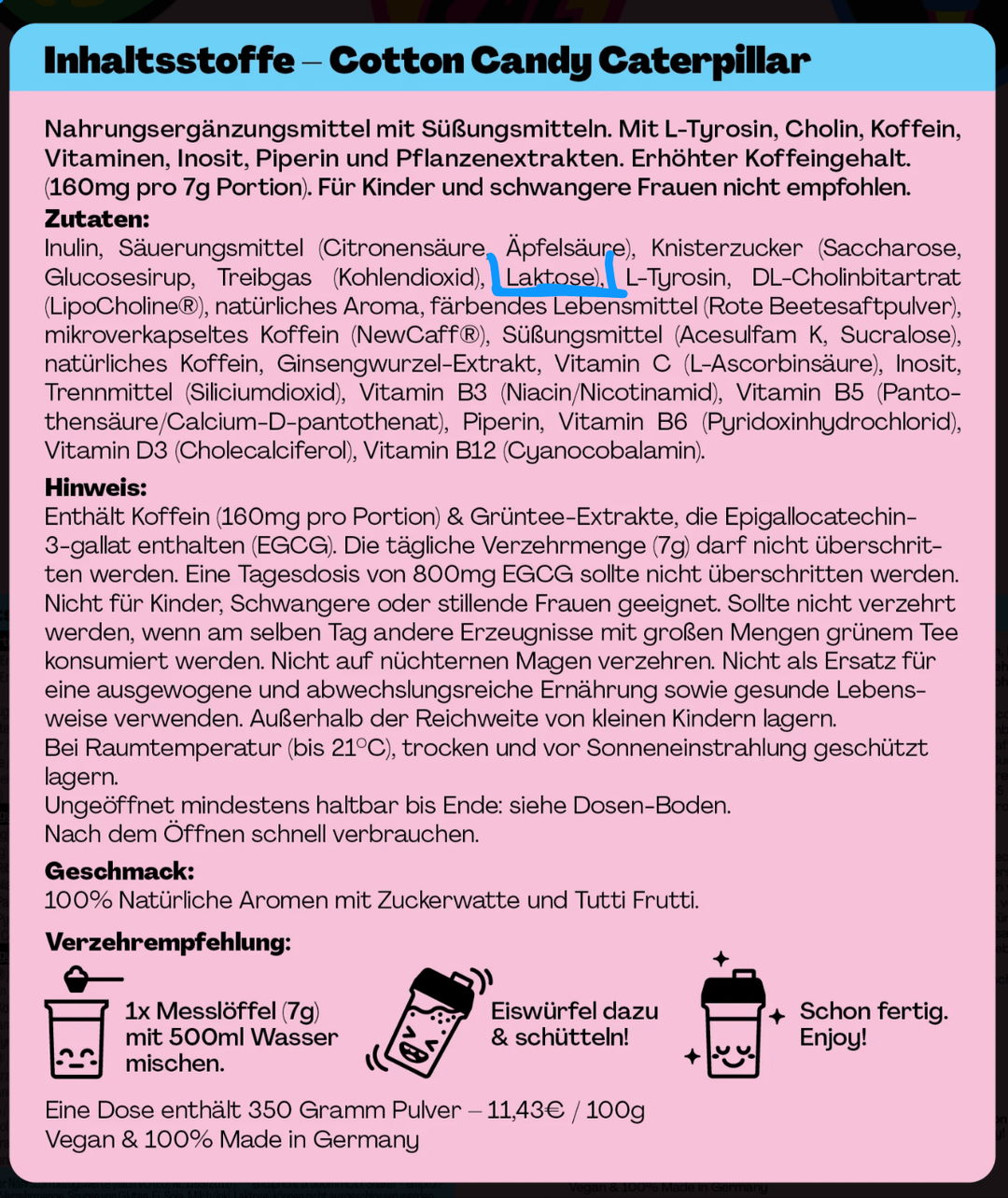 Ich hab die Dose hier stehen und kann bestätigen, dass bei mir auch Laktose UND Vegan draufsteht. Ich schreibe mal dem Kundensupport. Edit, hab schon eine Antwort bekommen: „Wir verarbeiten unsere Produkte generell ohne Gluten und Laktose. Dennoch ist es uns wichtig, transparent zu sein: Aufgrund der Produktionsabläufe und möglicher Kreuzkontamination können wir nicht garantieren, dass keine sehr geringen Spuren von Gluten oder Laktose enthalten sind“. Edit Nummer 2: nachdem ich nochmal explizit nachgehakt habe, dass Laktose als konkreter Inhaltsstoff deklariert ist, dann leider doch die Enttäuschung: „Bei HOLY Energy Caterpillar ist in sehr geringen Mengen Laktose enthalten, weil sie auf die Knallbonbons aufgetragen wird, damit sie nicht zusammenkleben“. Sehr schade, und wirklich unnötig. Wird wohl zeitnah auf der Website geändert. Ich frage nochmal ob sie die Knallbonbons nicht einfach rauslassen können, weil man die sowieso nicht beim Trinken spürt, sondern nur den Shaker knistern hört.