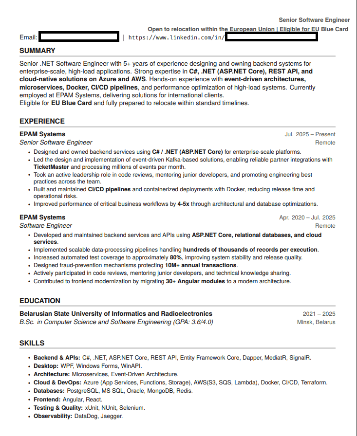 Für Feedback oder Vorschläge wäre ich dankbar. Ich möchte meinen Lebenslauf und mein LinkedIn-Profil verbessern, um häufiger von Arbeitgebern berücksichtigt zu werden, auch wenn ich ein Visum benötige.