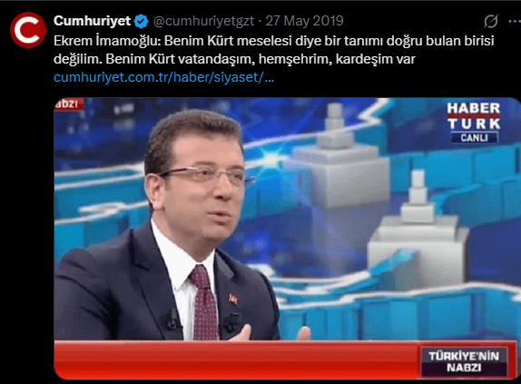 Ekrem İmamoğlu: Benim Kürt meselesi diye bir tanımı doğru bulan birisi değilim. Benim Kürt vatandaşım, hemşehrim, kardeşim var. Türk vatandaşı ne kadar teminatsa bu ülkenin Kürt kökenli vatandaşım, hemşehrim de o kadar teminattır. Ben bu akşam bir evdeydim. Gaziosmanpaşa’da bir evde iftarımı açtım. Çocuğumuzun, sokağımızın meselesi aynı. Devlet bütün süreçleri aklıselim, şeffaf yönetmesi lazım. Devletin bazı işleri vardır. Açılım dendi, Meclis’te insanlar anlatın bize, ne yaptığınızı bilmiyoruz dediler.