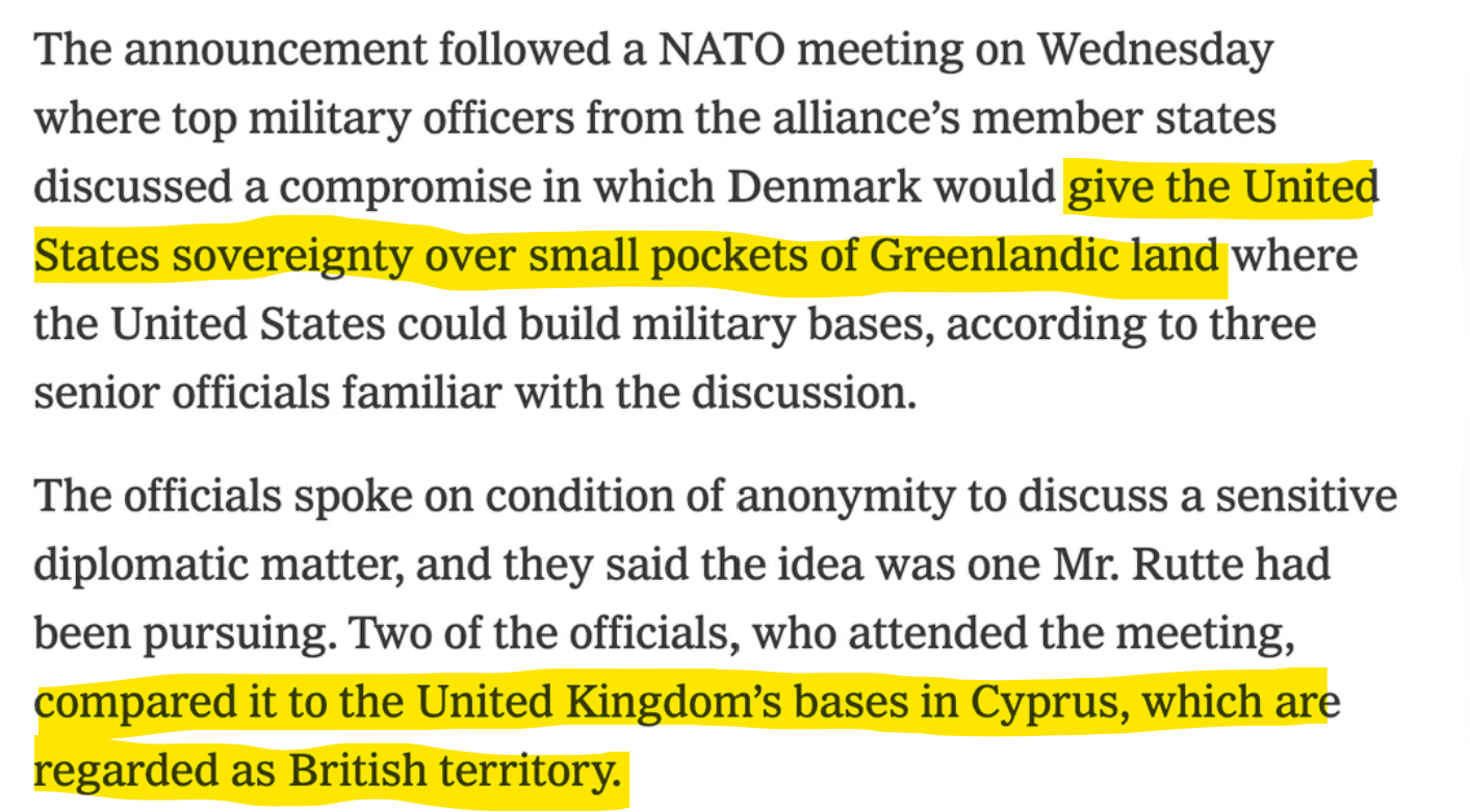 Rutte bot an, im Rahmen des Grönland-Deals (NYT) kleine Teile Grönlands zum offiziellen US-Territorium zu machen.