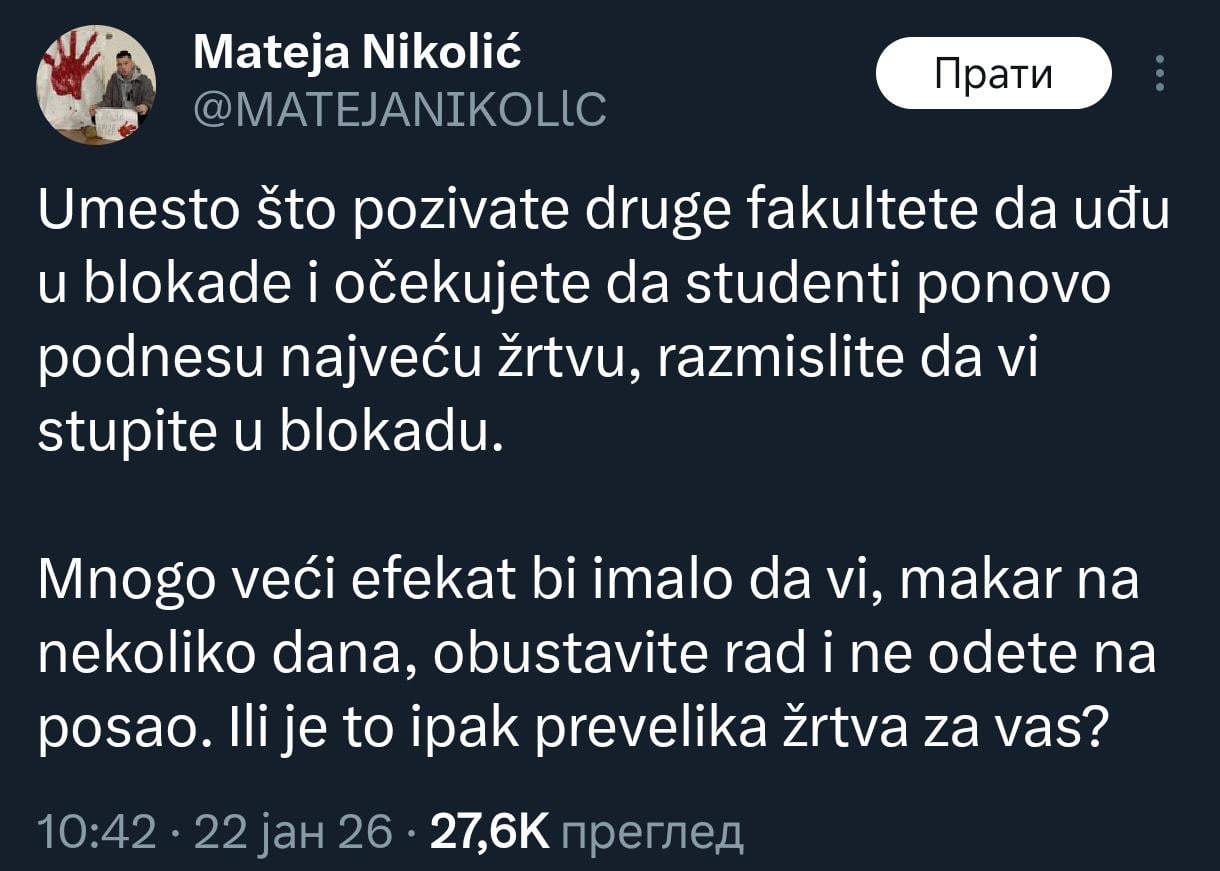 11. Okej. Evo ja sutra štrajkujem na svom poslu. Biću ja sam, možda bude još plafon petoro toliko osvešćenih pojedinaca. Zašto ostalih 198+ neće? Ne znam, zašto bi poslušali rendm tvit? Ako taj Generalni štrajk toliko ima smisla, zašto se glasnogovornici ove ideje ne potrude, organizuju, rašire je, naprave neku mrežu podrške da se ja i svi ostali osetimo zapravo sigurnim da možemo da uđemo u tu priču?