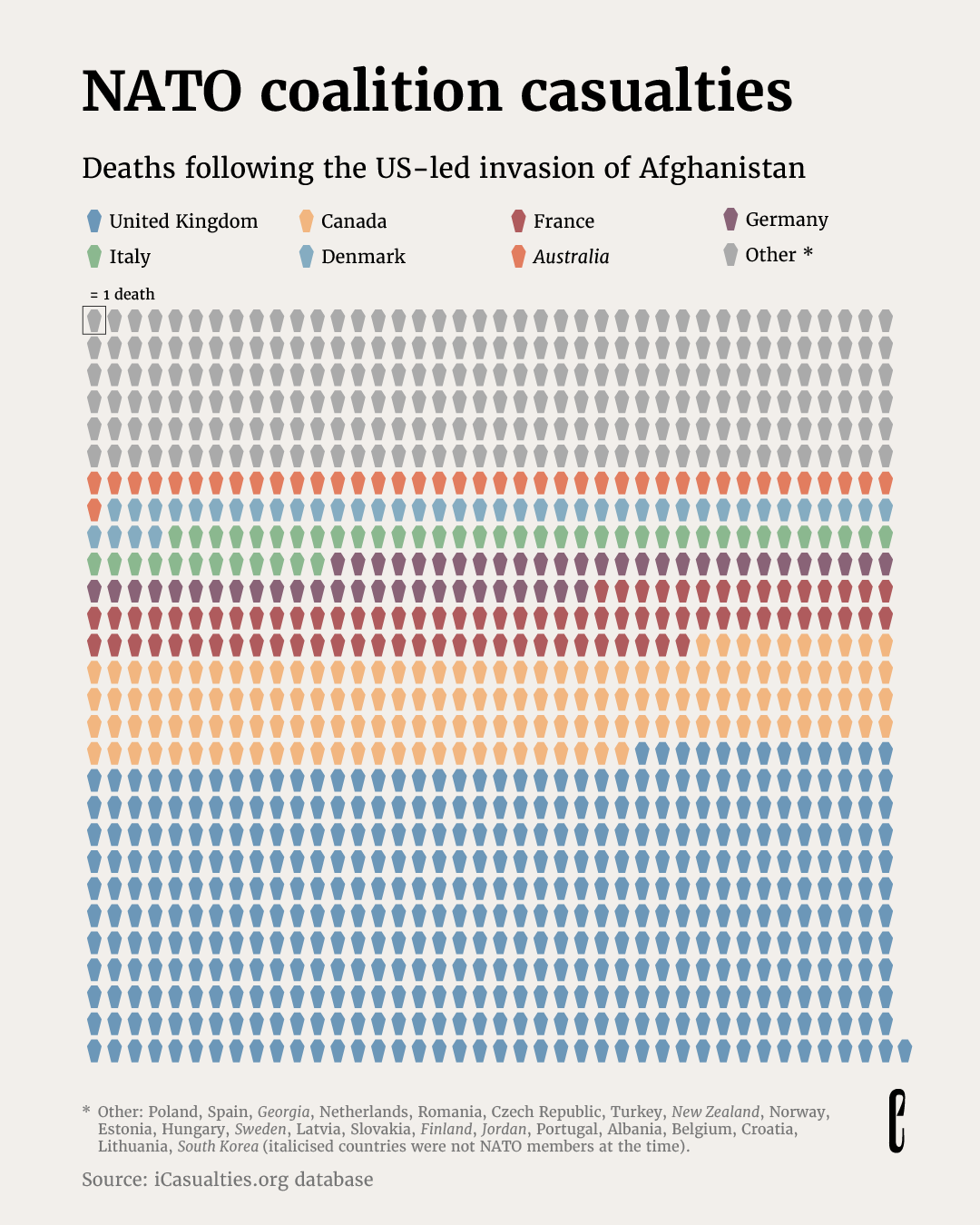 Visual I created for the European Correspondent in light of Trump’s threats to Greenland and NATO. The published version is accompanied by a caption with context: [https://europeancorrespondent.com/en/r/nato-coalition-casualties](https://europeancorrespondent.com/en/r/nato-coalition-casualties)