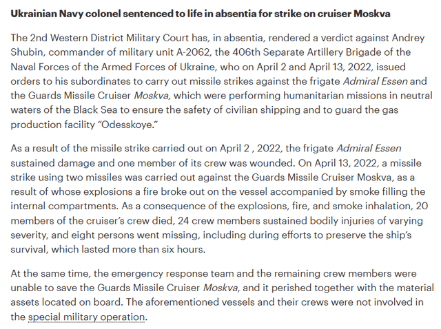 „The 2nd Western District Military Court has, in absentia, rendered a verdict against Andrey Shubin, commander of military unit A-2062, the 406th Separate Artillery Brigade of the Naval Forces of the Armed Forces of Ukraine, who on April 2 and April 13, 2022, issued orders to his subordinates to carry out missile strikes against the frigate Admiral Essen and the Guards Missile Cruiser Moskva, which were performing humanitarian missions in neutral waters of the Black Sea to ensure the safety of civilian shipping and to guard the gas production facility “Odesskoye.”