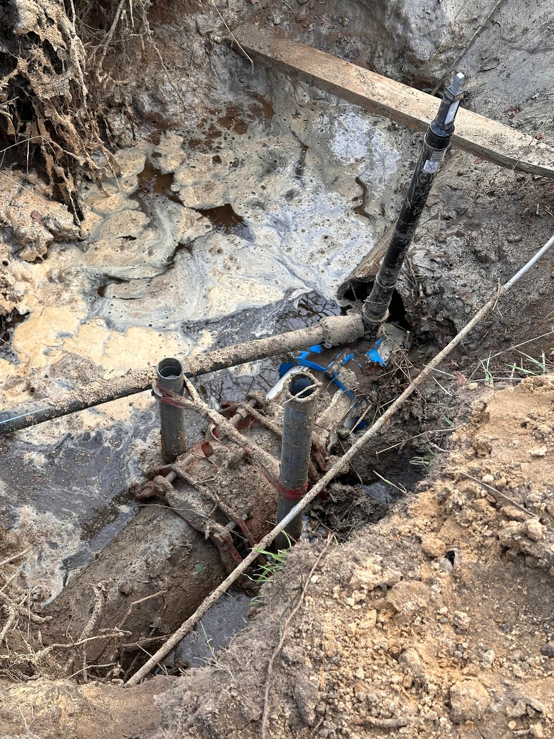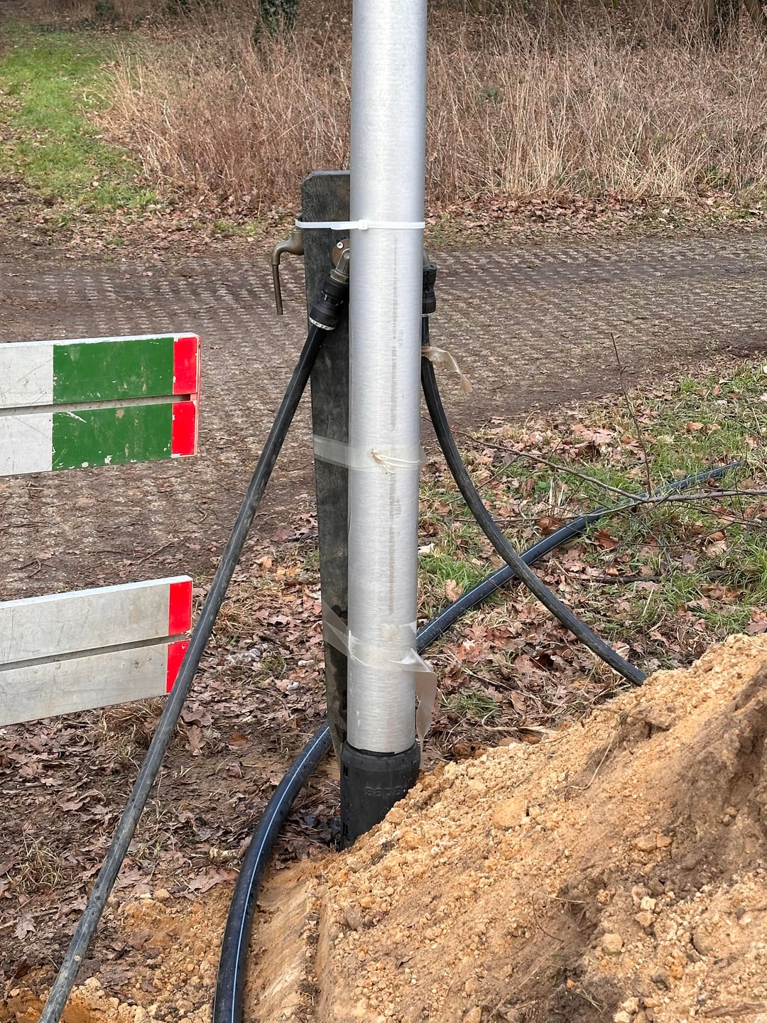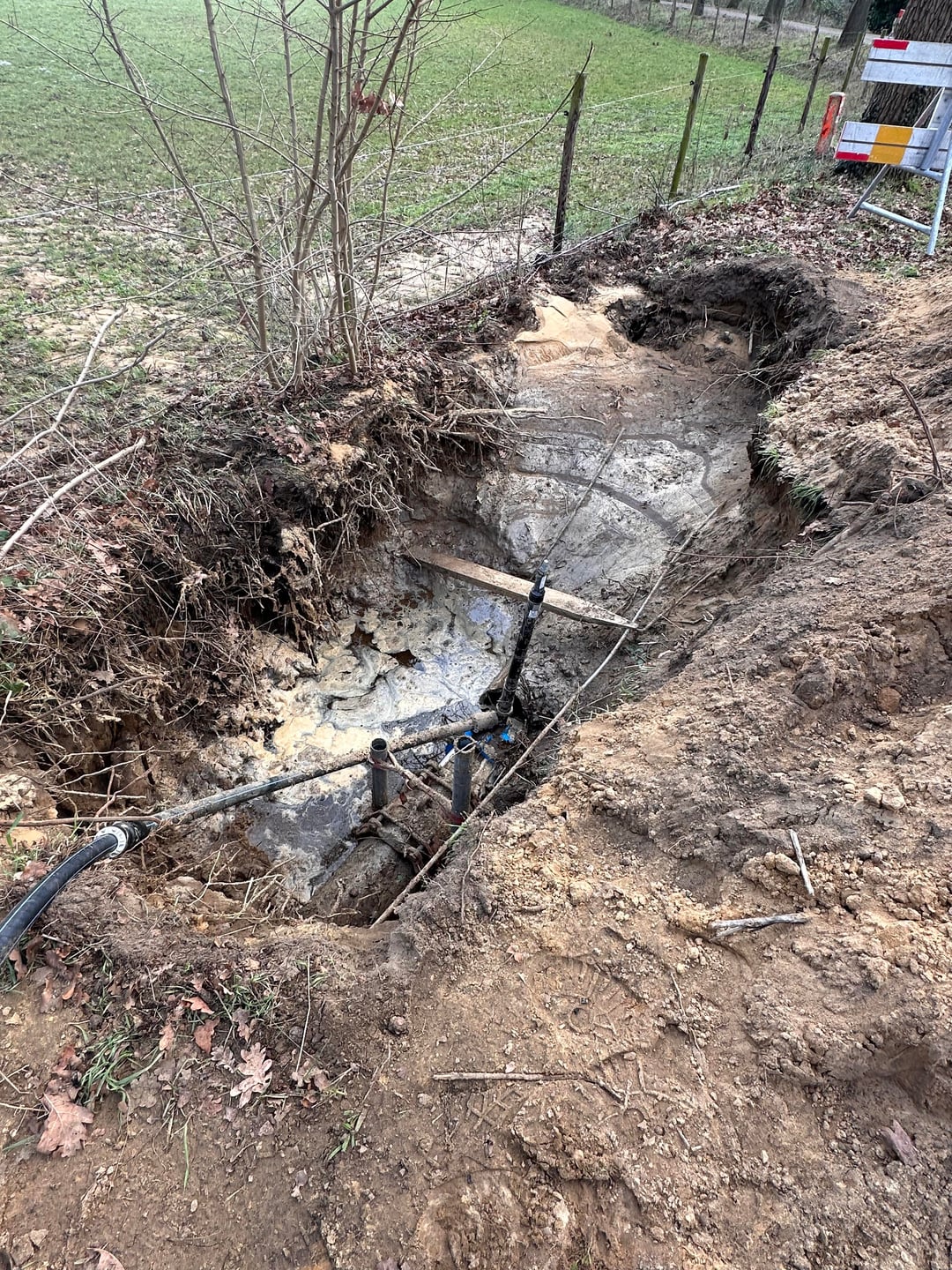 Heute habe ich beim Spaziergang eine Ausgrabung in der Nähe gesehen (siehe Foto). Es scheint, dass dort eine (Asbest-)Transportleitung kaputt gegangen und verschlossen wurde. Es gibt keine Absperrbänder oder klare Warnungen, nur ein paar Absperrungen, und alles andere ist noch offen. In der Gegend sind neue Bauarbeiten im Gange.