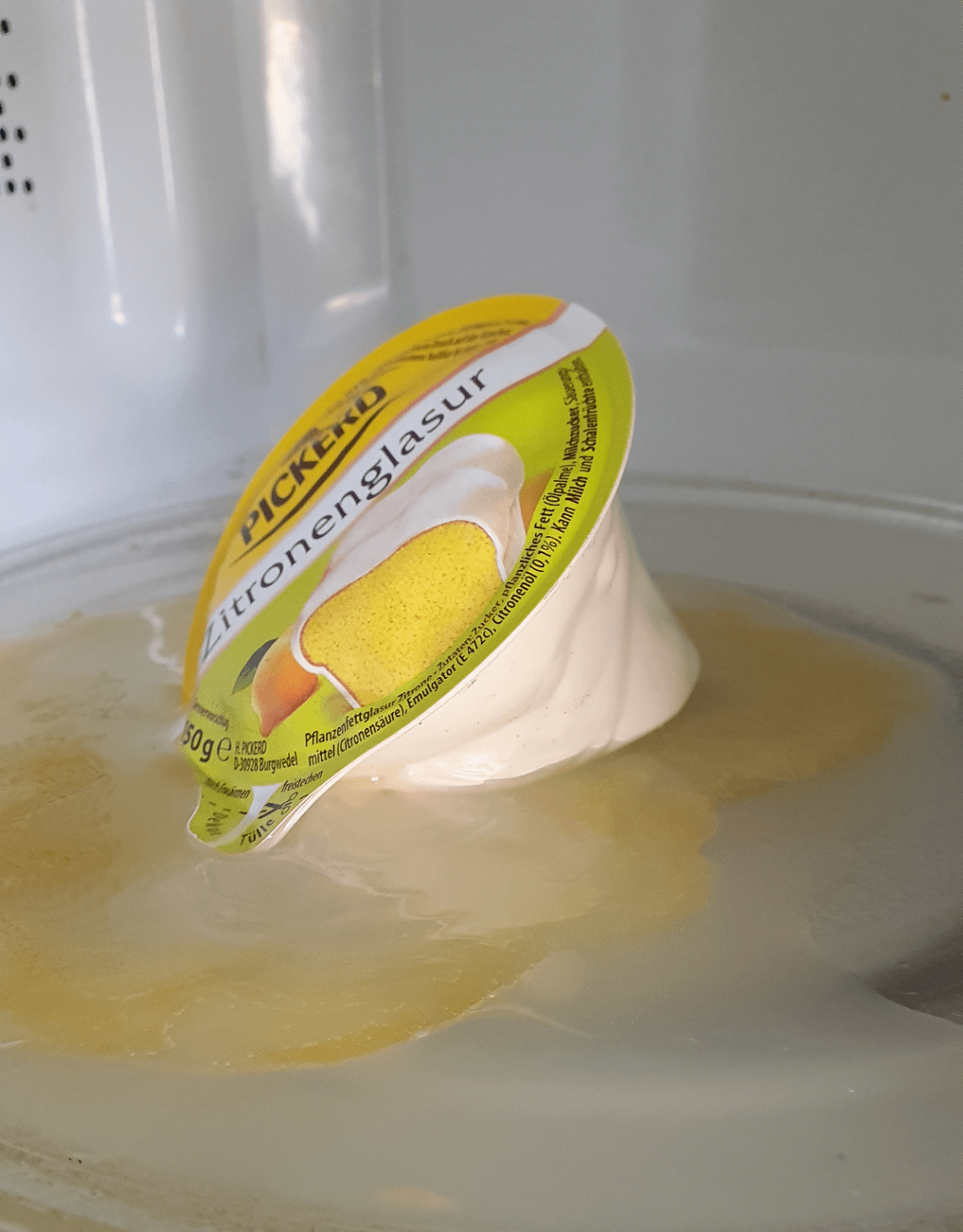 Ich weiß nicht. Ich würde niemals Plastik eines Wegwerfproduktes erhitzen und den Inhalt dann auf ein Lebensmittel kippen. Offensichtlich verändert sich das Plastik und gibt Stoffe an den Inhalt ab. Sonst wäre es nicht geschmolzen.