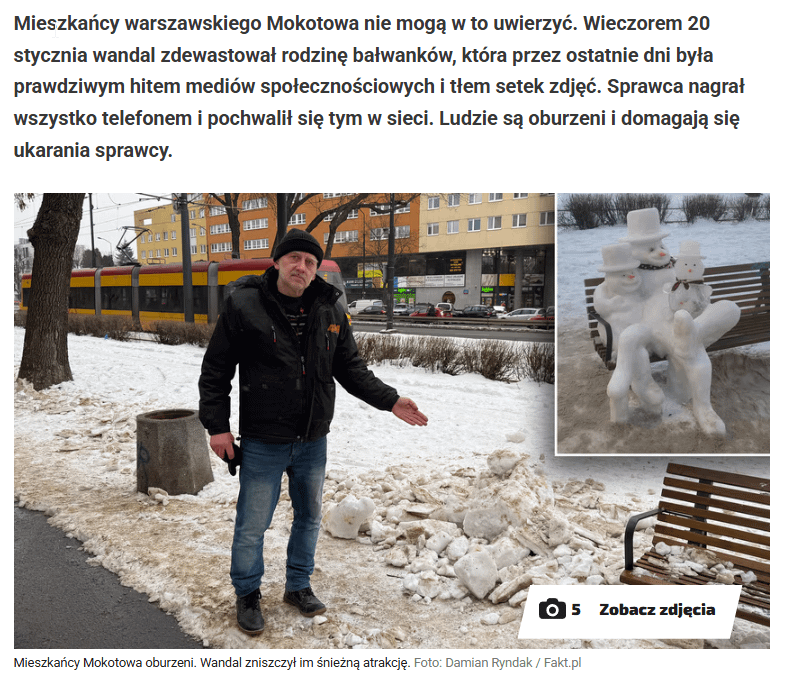 Ja rozumiem że są oburzeni że im ktoś popsuł fajne bałwany, ale w jaki dokładnie sposób chcą żeby sprawca został ukarany? Jest jakiś paragraf na psucie bałwanów?