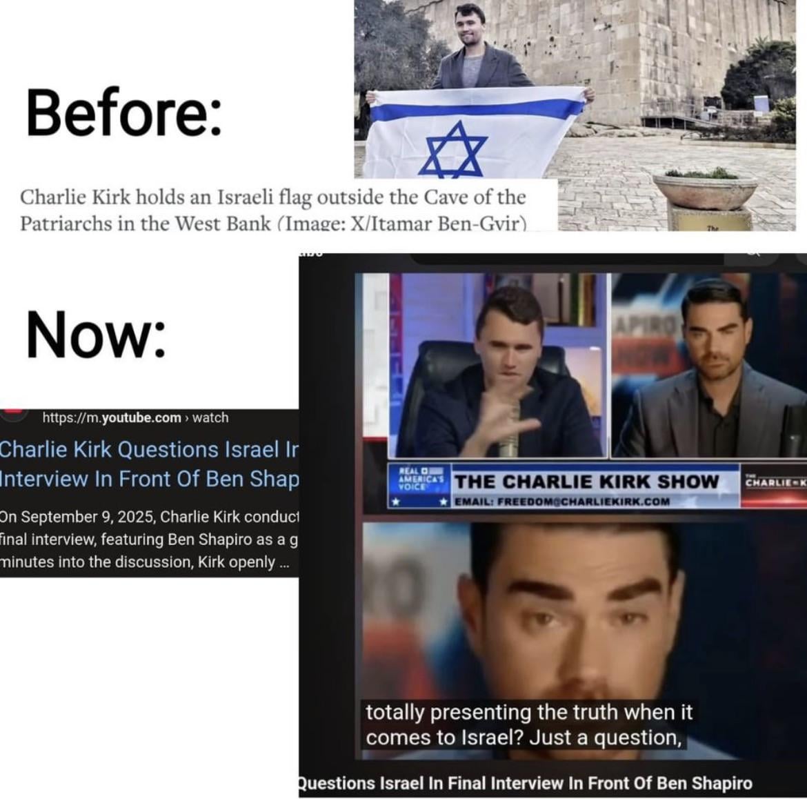 [The last month of Charlie’s life consisted of Zionists routinely pressuring and threatening Charlie for his shifting views on Israel. It should disturb you that for the right price, Turning Point was seemingly willing to bury all of this and instead welcome the very same people who tormented him..](https://www.twitter.com/RealCandaceO/status/2014725775082037745)