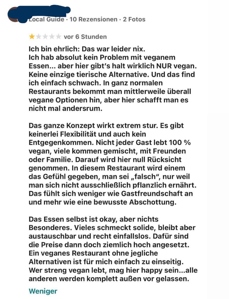 Ist zwar dumm, gibt aber genug Veganer, die sich genauso über ein Steakhaus, welches nichts veganes anbietet, aufregen 😅