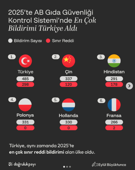 Die Türkei war im Jahr 2025, wie auch in den Jahren 2023 und 2024, das Land, das die meisten Meldungen im Rahmen des Schnellwarnsystems für Lebensmittel und Futtermittel (RASFF), dem Kontrollsystem der Europäischen Union für Lebensmittelsicherheit, erhielt.