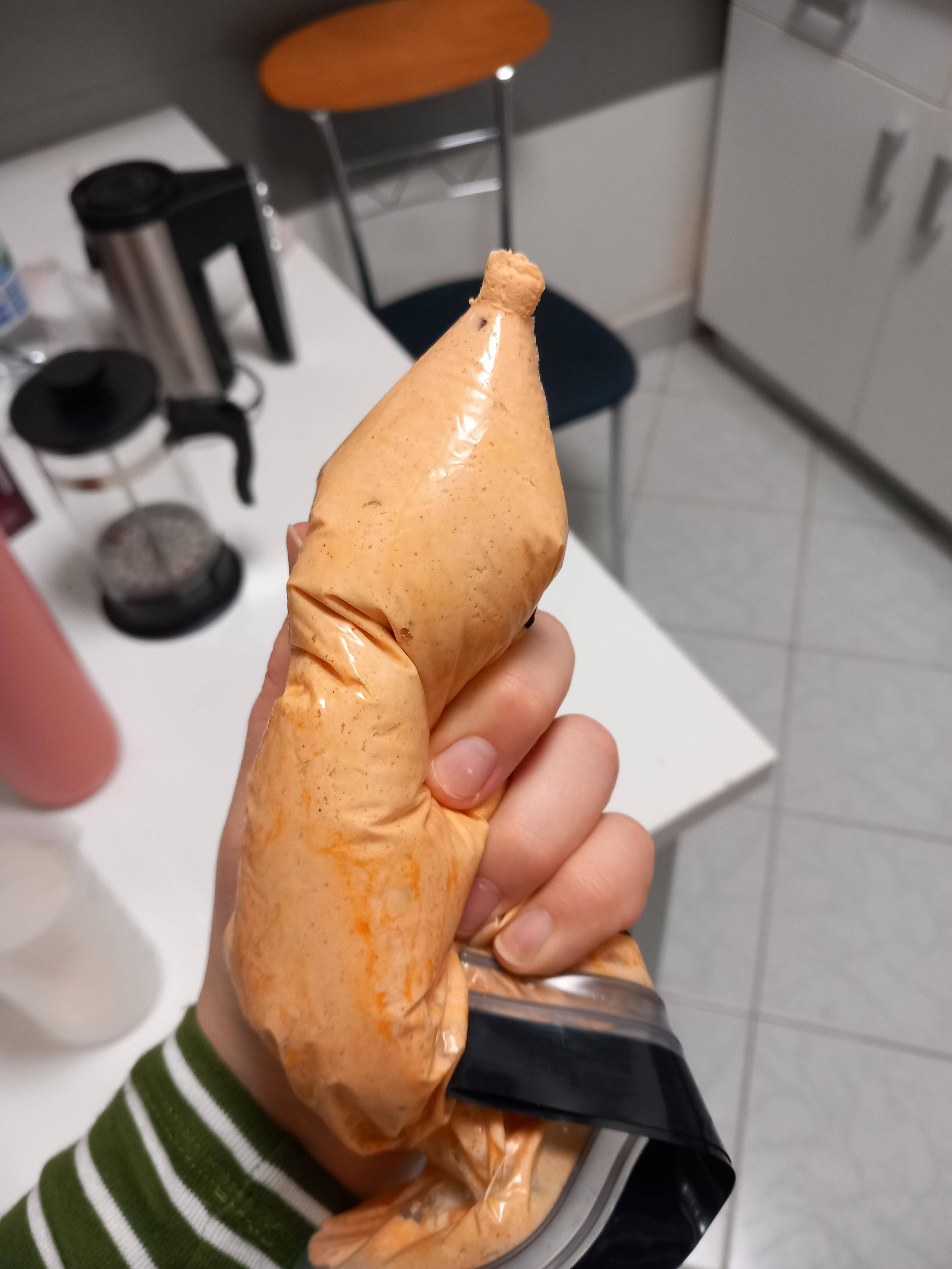In den Beutel geben und dann direkt in den Mund geben. (Als Zwischenschritt empfehle ich, den Aufstrich im Kühlschrank zu lassen, die Zwiebel neutralisiert sich dann ein wenig – sie wird süßer und der Aufstrich wird etwas fester und hat eine schmackhaftere Konsistenz)