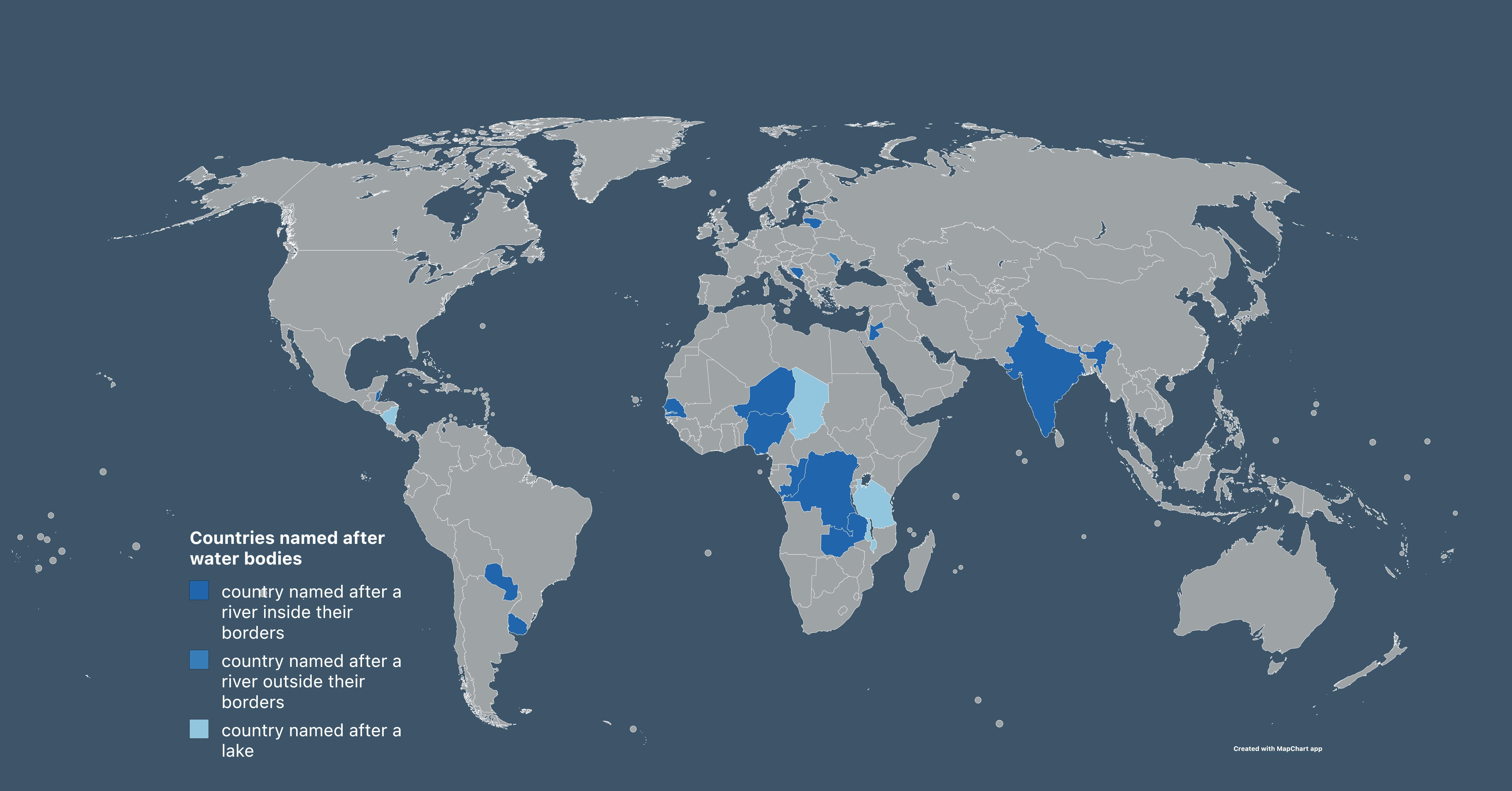Not a country per se but the Iberian peninsula is named after a river, the modern Ebro, ancient Iber, which I think is quite neat