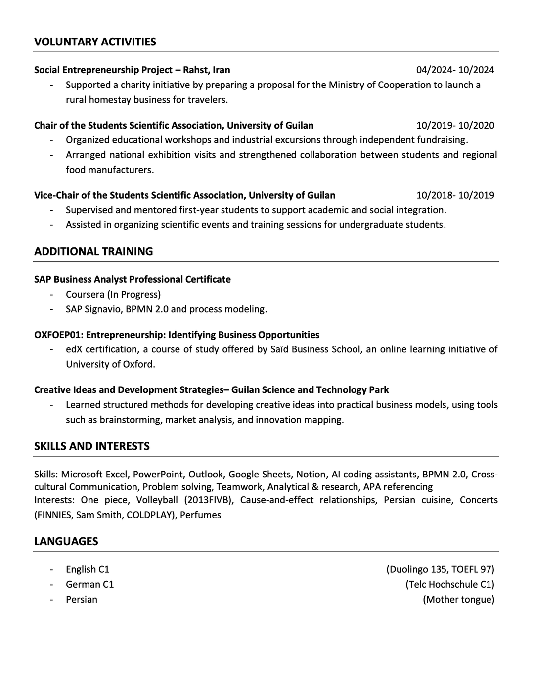 Einige von Ihnen haben erwähnt, dass ich meinen Lebenslauf auf reddit veröffentlichen sollte, um bessere Einblicke in meine Situation zu erhalten. Ich habe versucht, meine persönlichen Daten zu verbergen. (Außerdem habe ich eine andere Version, in der ich auch mein Bild hochgeladen habe. Lassen Sie mich wissen, welches besser zur deutschen Arbeitskultur passt.)