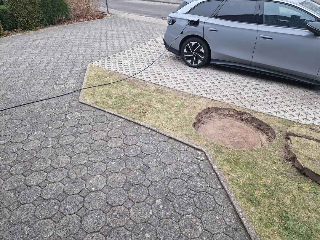 Eine ordentliche Wallbox-Halterung. Dann sparst du die Stolperfalle quer übern Hof
