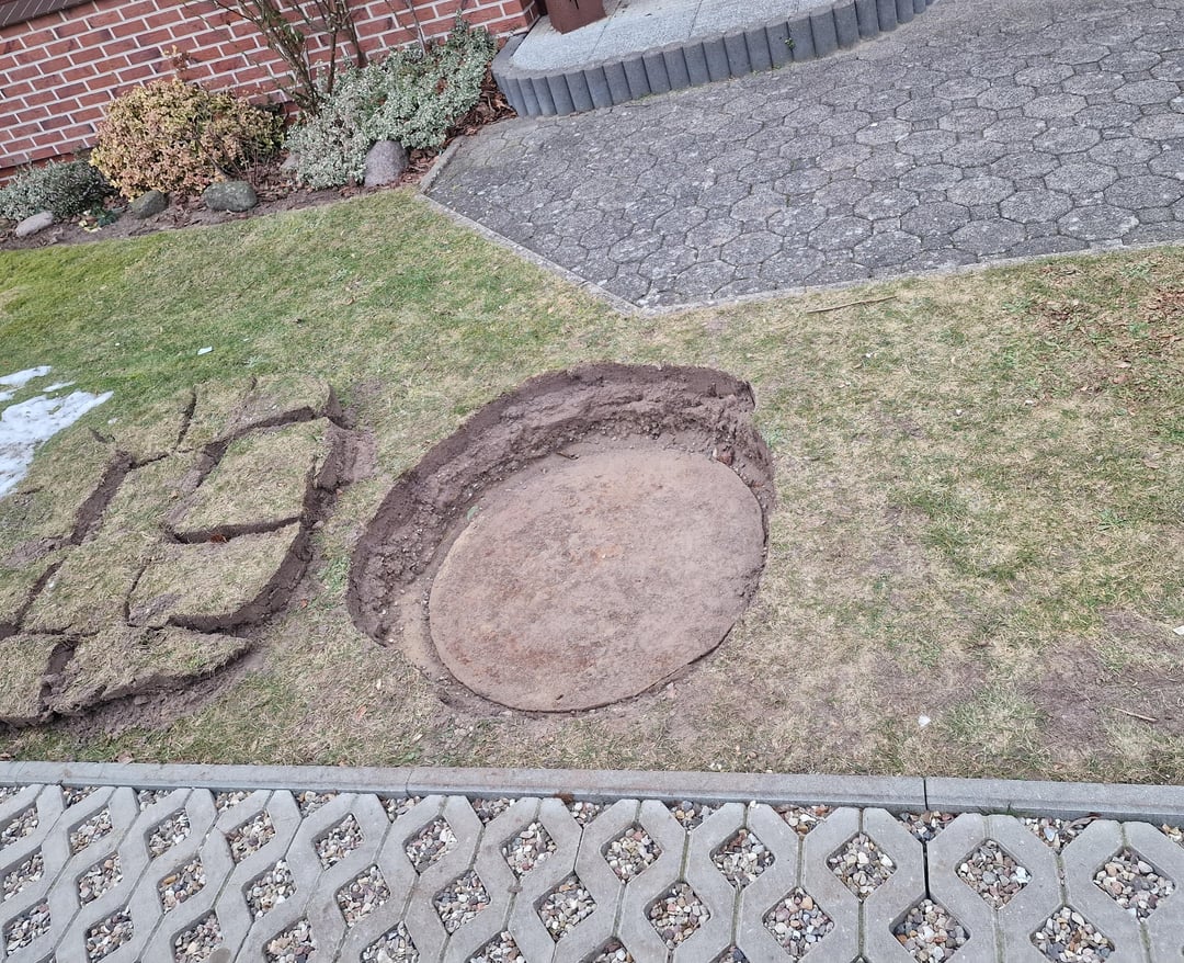 Folgendes Problem: Ich habe vor Kurzem den Revisionsschacht für das Abwasser gefunden. Es ist ein Betonschacht auf dem ein einfacher (verrosteter) Metalldeckel liegt (Durchmesser ca. 1m). Der Vorbesitzer hatte da Rasen drüber gemacht. Das Ding liegt genau zwischen Haustür und neuem Kfz-Stellplatz, wo es auf kleiner Entfernung ein Höhenunterschied von ca. 15 cm gibt.