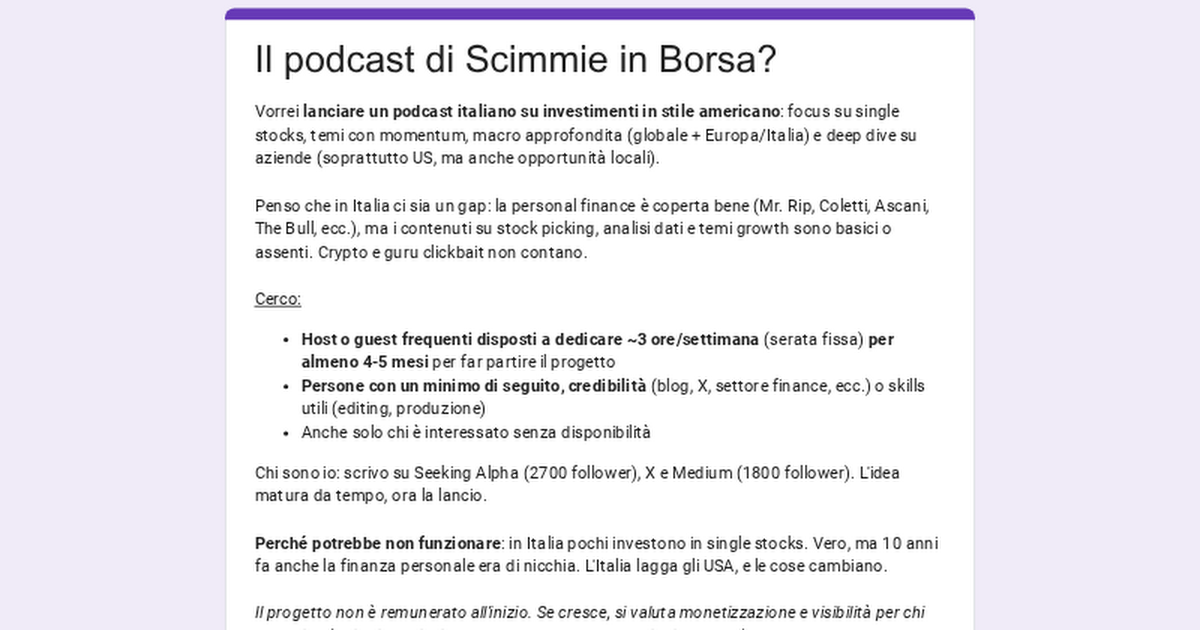 I like the idea and hope it will work out but im unsure how helpful it is fro Italian Speakers in Swituerland. WIll the Podcast really help them? Italian investing is very different from Swiss