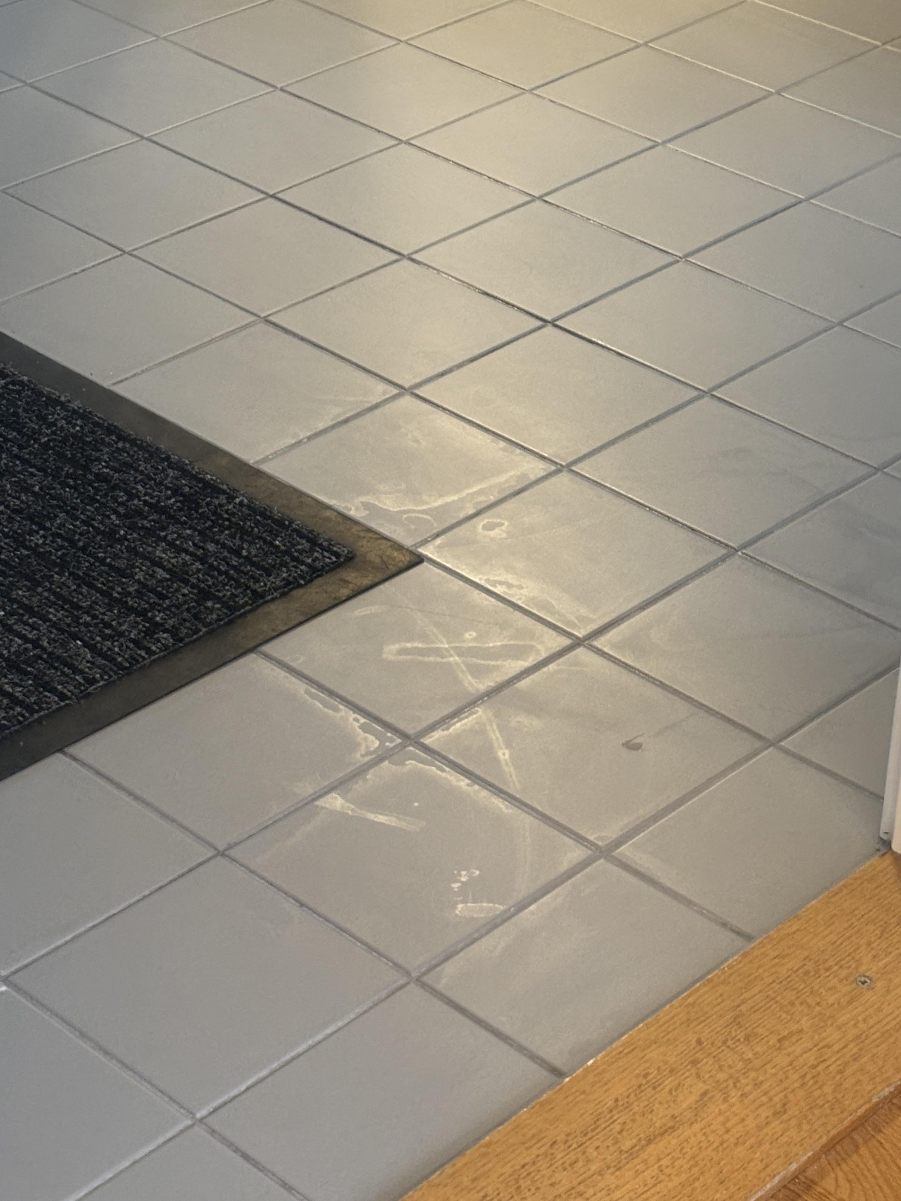 De kanske har vaxat kaklet, det låter konstigt, men det är en metod som används för att göra kakel lätta att moppa (tror de i alla fall). Testa med vaxborttagare, låt det verka lite, skrubba och tvätta normalt och se om det ser bättre ut. Jag skulle prova på en enda kakelplatta först bara för att testa. Beroende på hur många lager vax det finns kan du behöva skrubba ner dem.