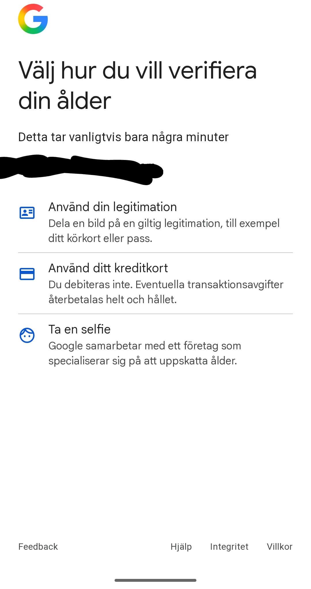 Hatar att verifiera men just att verifiera via betalkortet är smidigt, tumme upp till google för den. Kortet används redan hos dom för att köpa appar och mikrotransaktioner så känns som en mindre kränkning än att ladda upp leg/bilder.