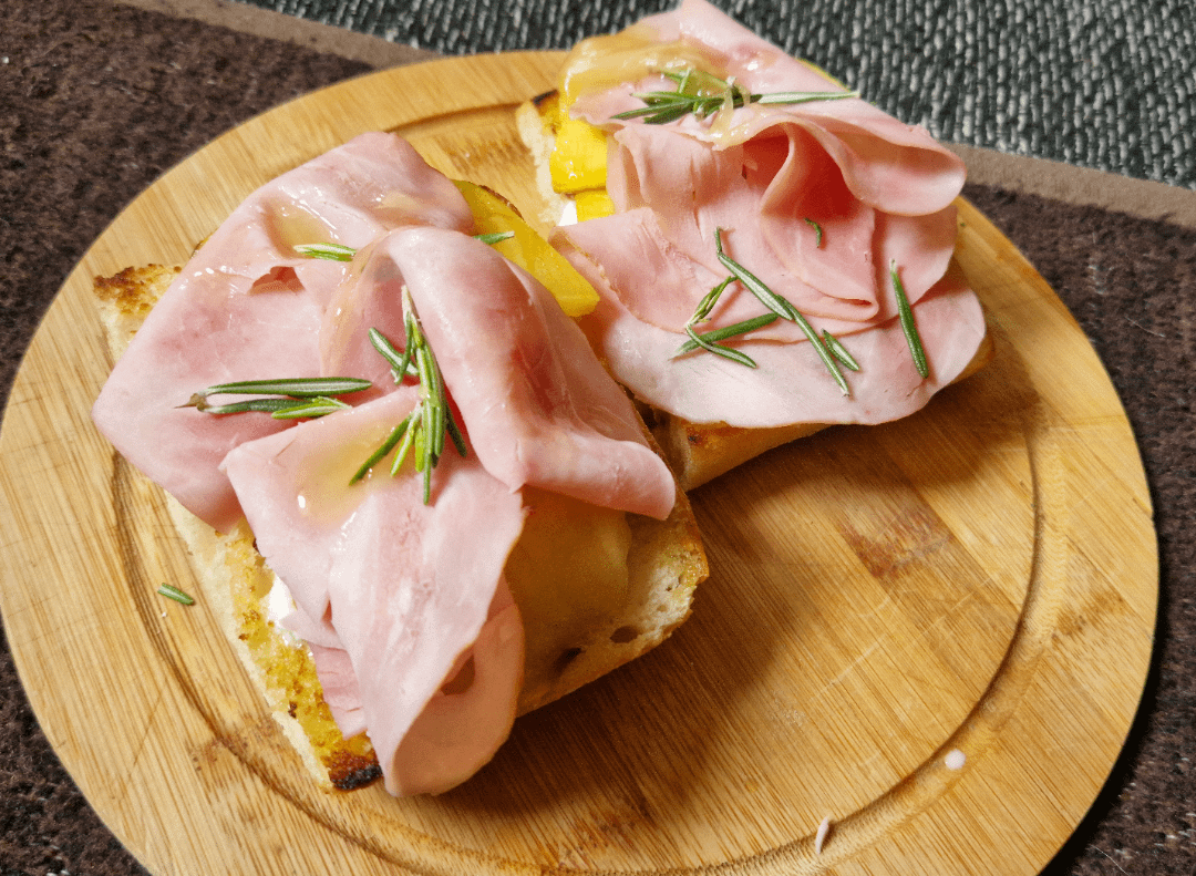 Das Brot mit Büffelmozzarella belegen, die Mango drauf und dann den Schinken (idealerweise Prociutto). Noch ein bisschen frischen Rosmarin draufstreuen und ein paar Kleckse Honig hier und da. Fertig 😅