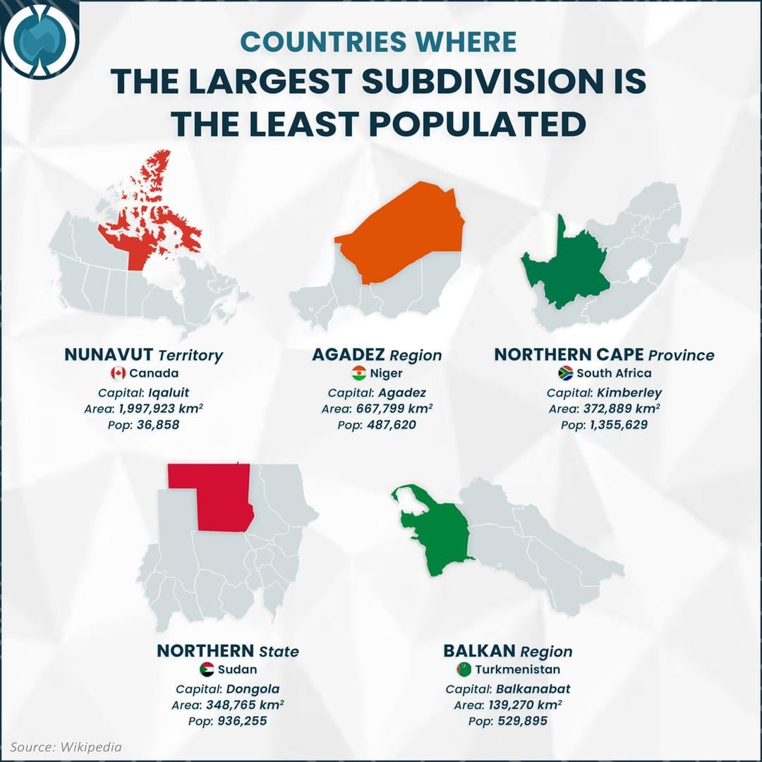 In einigen Ländern ist die flächenmäßig größte Verwaltungseinheit auch die am dünnsten besiedelte
