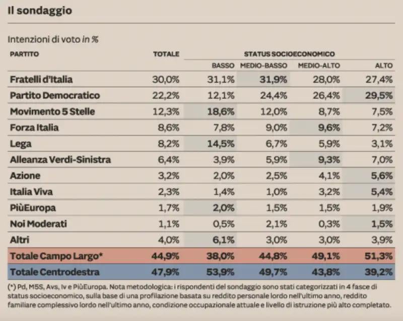 In realtà l’unico dato che fa veramente ridere è AVS. Per il resto entrambi le coalizioni hanno un partito forte tra il ceto medio basso e uno tra il ceto medio alto.