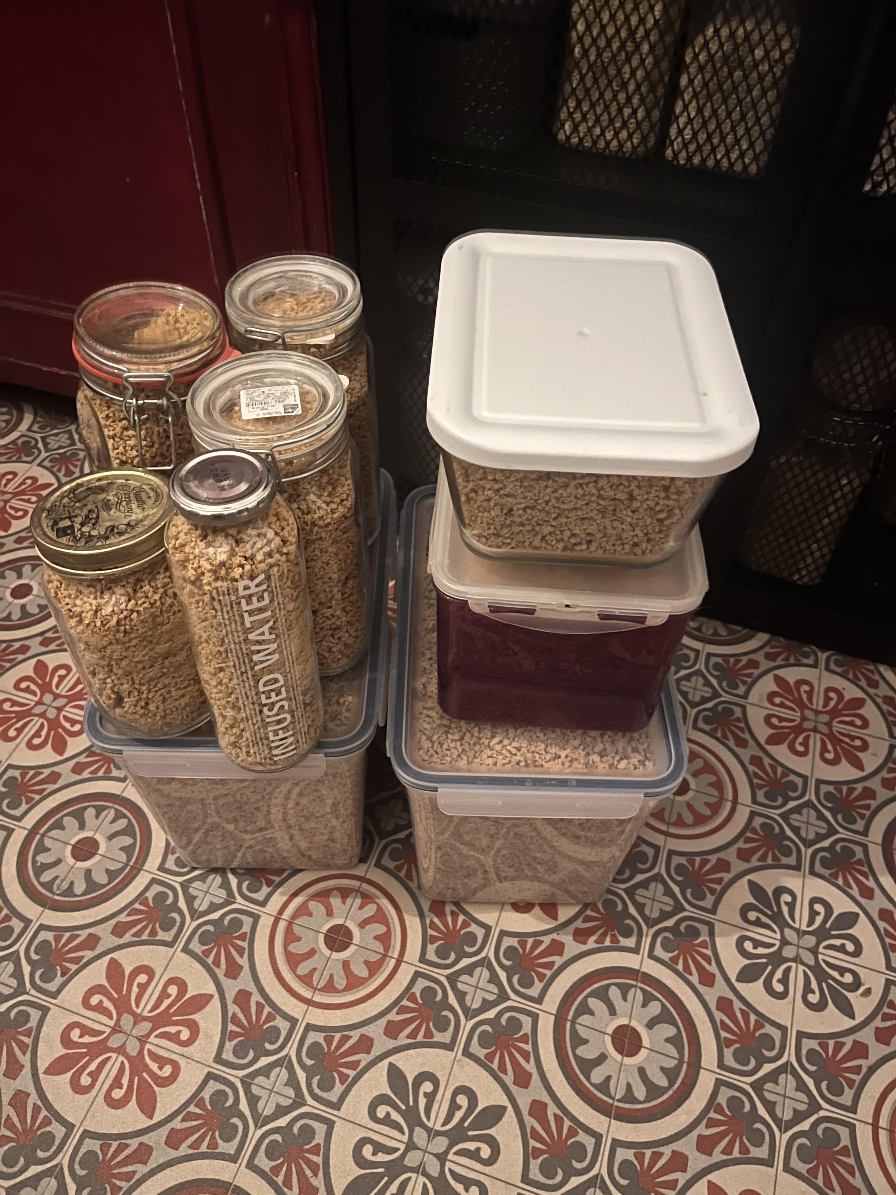 Sieht bei uns ähnlich aus wie bei dir. Wir haben bei Flaschenland so 5kg Vorratsgläser geholt um das zu verstauen.