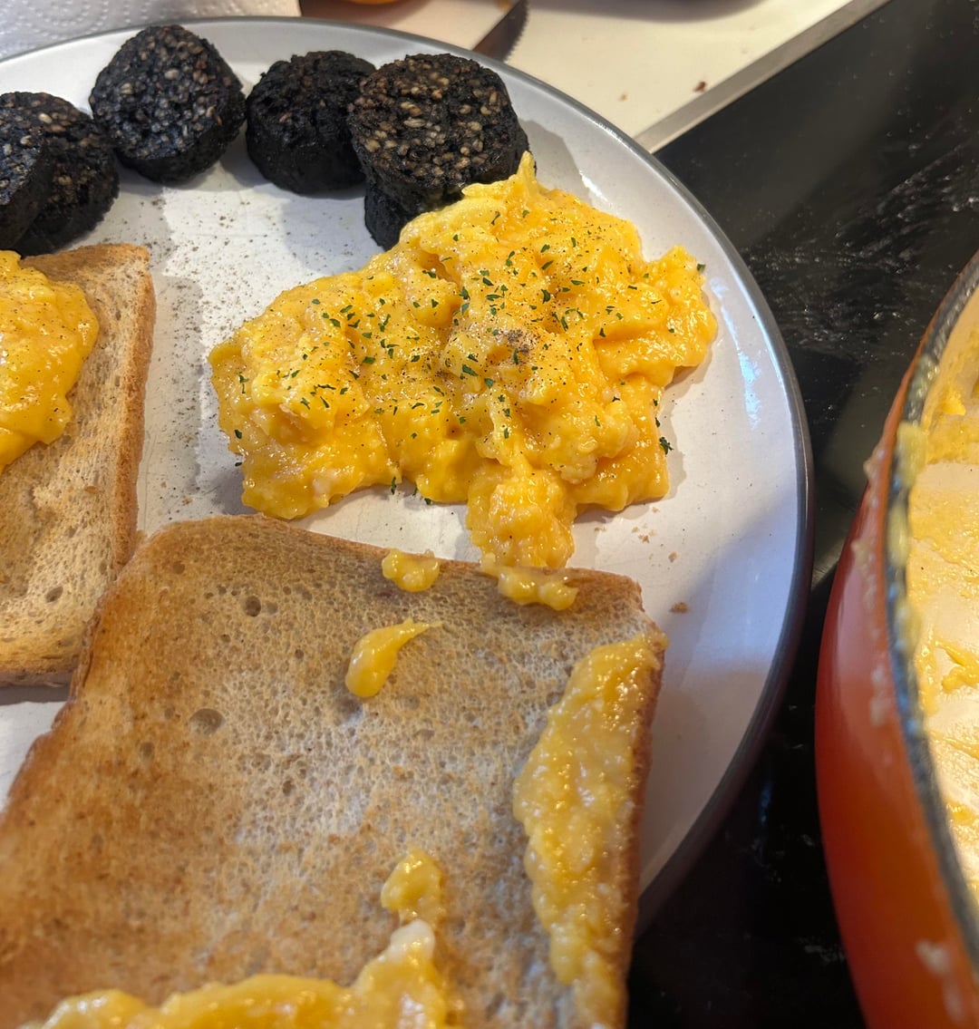 Französisches Rührei! Sooo gut! Gordon Rasmay hat’s etwas zeitoptimiert, indem er mit höherer Hitze arbeitet, aber das Ei immer dann, wenn es am Boden festbappt, vom Herd nimmer und weiterrührt, bis es sich löst. Gleiches Ergebnis, nur dauert‘s nicht so lang.