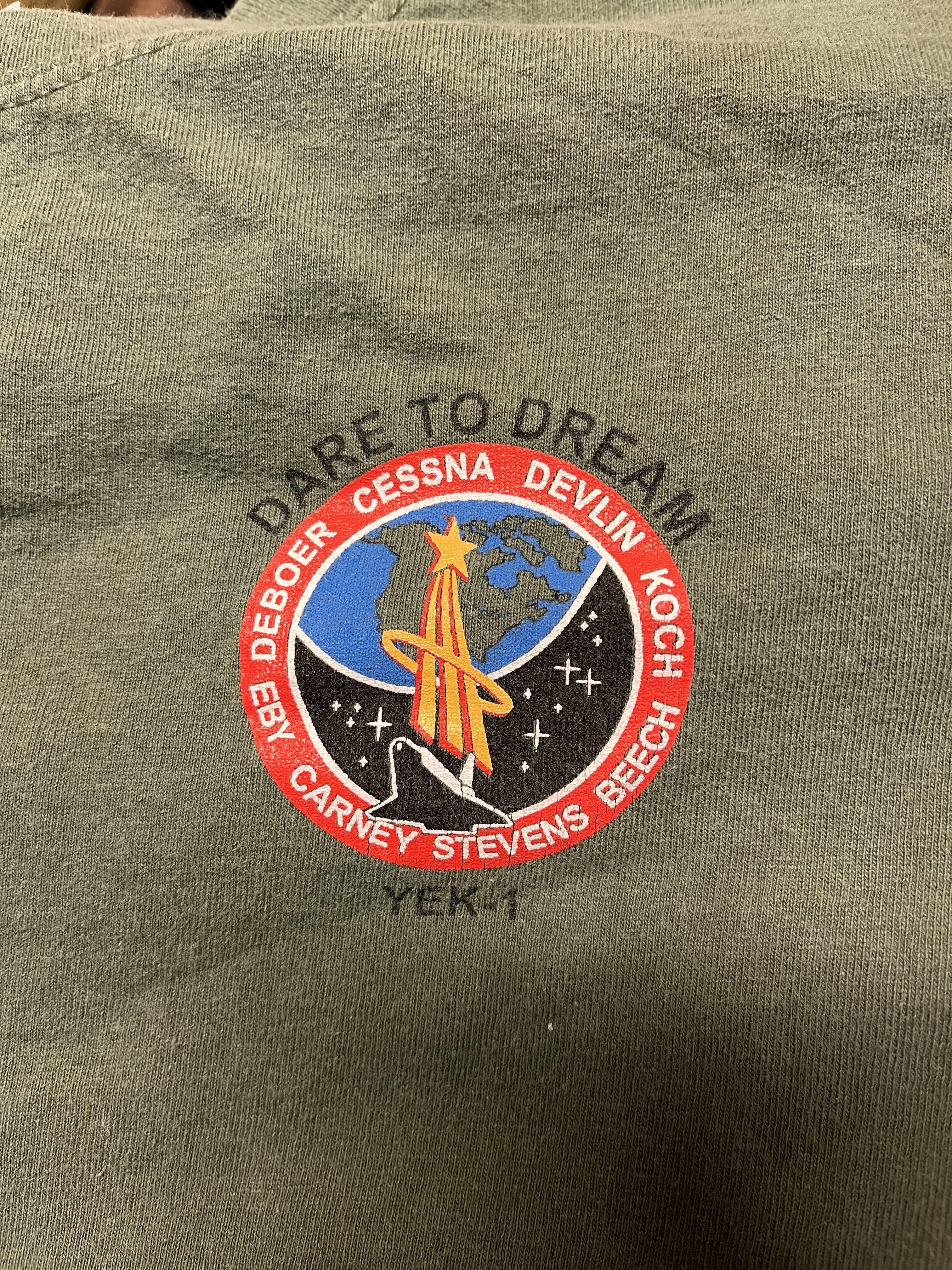 The names are unrelated to the mission, though if you ask a clanker it will claim it is the astronaut’s names. I’m guessing someone took the style of the STS-59 patch and made shirts for something like a bachelor party.