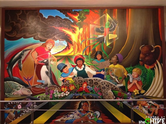 The mural of the burning forest is supposed to show the death of life if we continue to destroy our environment. The second part of the mural that’s cut off shows humanity coming together to save the environment and celebrate nature’s diversity.
