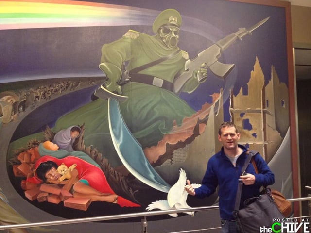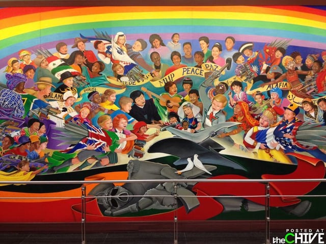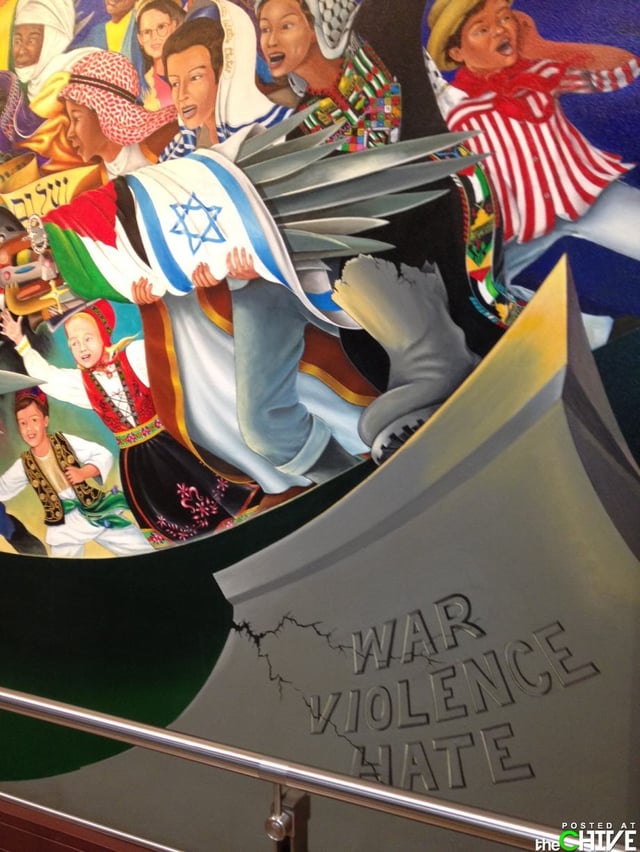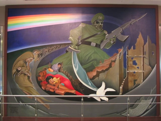 The soldier that has a sword stabbing a dove illustrates the death of peace, with dead children lying on the ground and their mother’s crying over them, illustrating the horrors of tyranny. The second part of the mural shows the death of the soldier with two doves, signifying peace. The third shows children dreaming of a better world. The fourth shows the children destroying the weapons of war to build a better future.